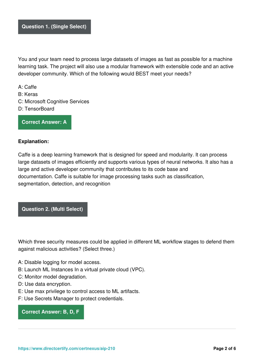 Question 1. (Single Select) You and your team need to process large datasets of images as fast as possible for a machine learning task. The project will also use a modular framework with extensible code and an active developer community. Which of the following would BEST meet your needs? A: Caffe B: Keras C: Microsoft Cognitive Services D: TensorBoard Correct Answer: A Explanation: Caffe is a deep learning framework that is designed for speed and modularity. It can process large datasets of images efficiently and supports various types of neural networks. It also has a large and active developer community that contributes to its code base and documentation. Caffe is suitable for image processing tasks such as classification, segmentation, detection, and recognition Question 2. (Multi Select) Which three security measures could be applied in different ML workflow stages to defend them against malicious activities? (Select three.) A: Disable logging for model access. B: Launch ML Instances In a virtual private cloud (VPC). C: Monitor model degradation. D: Use data encryption. E: Use max privilege to control access to ML artifacts. F: Use Secrets Manager to protect credentials. Correct Answer: B, D, F https://www.directcertify.com/certnexus/aip-210 Page 2 of 6