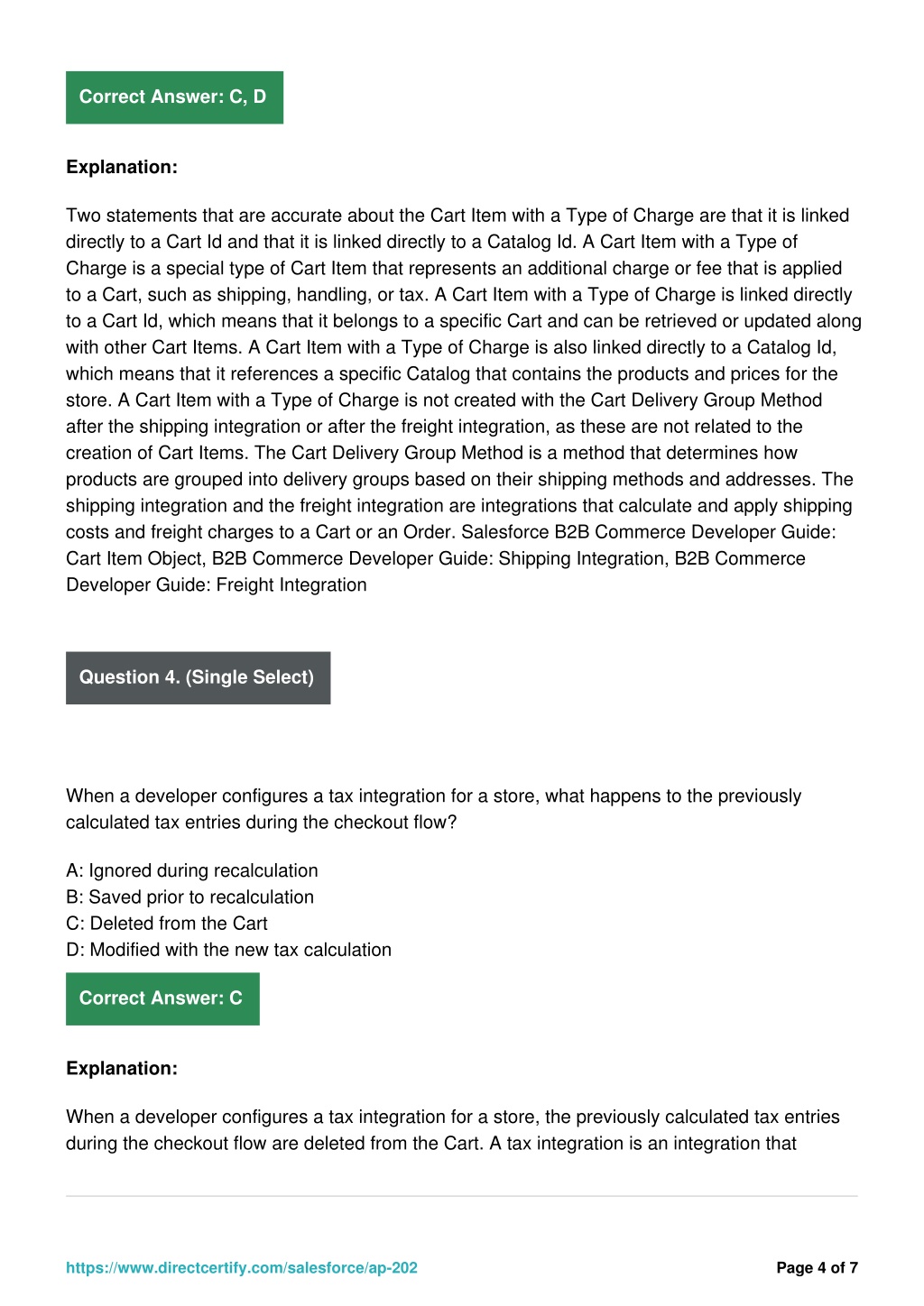 Correct Answer: C, D Explanation: Two statements that are accurate about the Cart Item with a Type of Charge are that it is linked directly to a Cart Id and that it is linked directly to a Catalog Id. A Cart Item with a Type of Charge is a special type of Cart Item that represents an additional charge or fee that is applied to a Cart, such as shipping, handling, or tax. A Cart Item with a Type of Charge is linked directly to a Cart Id, which means that it belongs to a specific Cart and can be retrieved or updated along with other Cart Items. A Cart Item with a Type of Charge is also linked directly to a Catalog Id, which means that it references a specific Catalog that contains the products and prices for the store. A Cart Item with a Type of Charge is not created with the Cart Delivery Group Method after the shipping integration or after the freight integration, as these are not related to the creation of Cart Items. The Cart Delivery Group Method is a method that determines how products are grouped into delivery groups based on their shipping methods and addresses. The shipping integration and the freight integration are integrations that calculate and apply shipping costs and freight charges to a Cart or an Order. Salesforce B2B Commerce Developer Guide: Cart Item Object, B2B Commerce Developer Guide: Shipping Integration, B2B Commerce Developer Guide: Freight Integration Question 4. (Single Select) When a developer configures a tax integration for a store, what happens to the previously calculated tax entries during the checkout flow? A: Ignored during recalculation B: Saved prior to recalculation C: Deleted from the Cart D: Modified with the new tax calculation Correct Answer: C Explanation: When a developer configures a tax integration for a store, the previously calculated tax entries during the checkout flow are deleted from the Cart. A tax integration is an integration that https://www.directcertify.com/salesforce/ap-202 Page 4 of 7