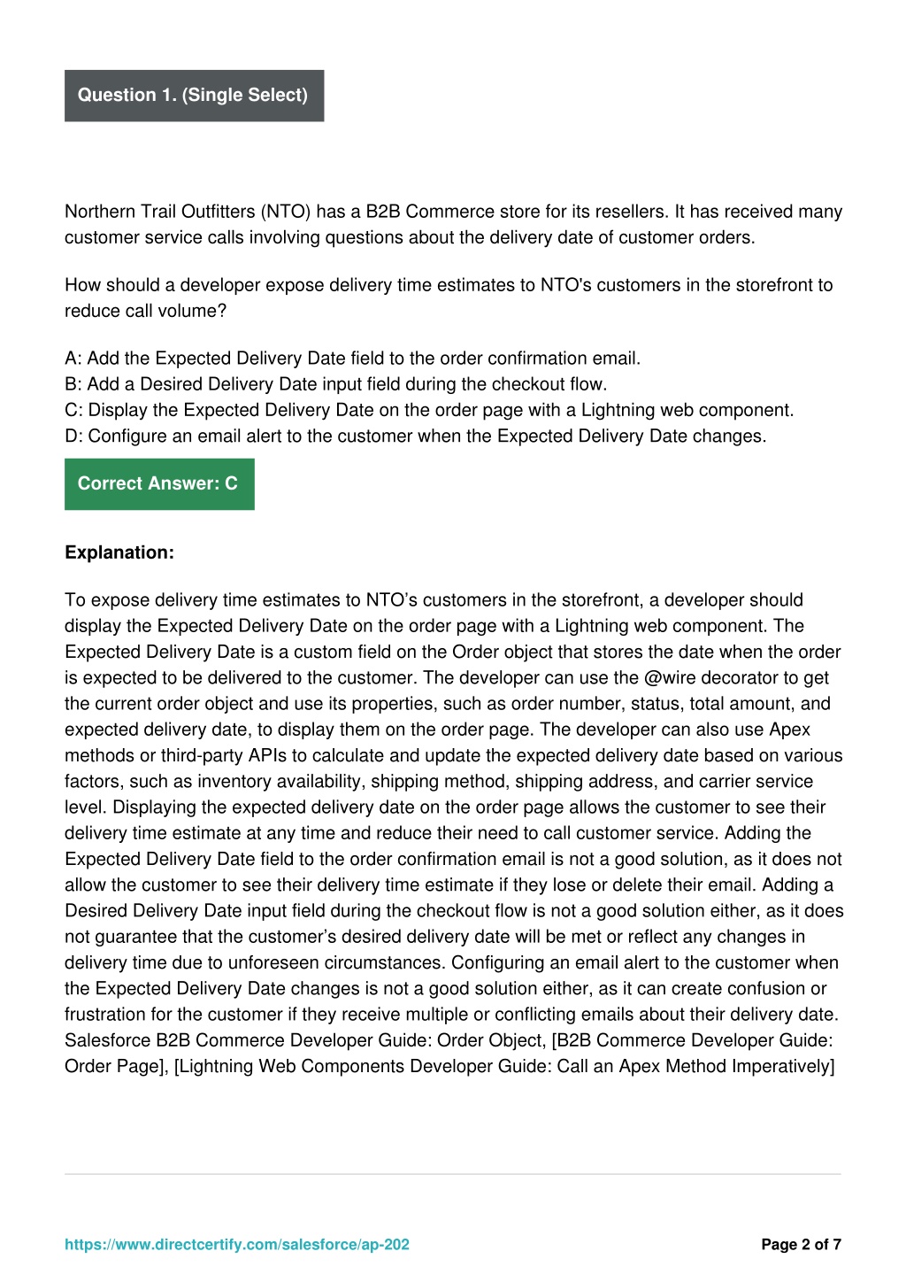 Question 1. (Single Select) Northern Trail Outfitters (NTO) has a B2B Commerce store for its resellers. It has received many customer service calls involving questions about the delivery date of customer orders. How should a developer expose delivery time estimates to NTO's customers in the storefront to reduce call volume? A: Add the Expected Delivery Date field to the order confirmation email. B: Add a Desired Delivery Date input field during the checkout flow. C: Display the Expected Delivery Date on the order page with a Lightning web component. D: Configure an email alert to the customer when the Expected Delivery Date changes. Correct Answer: C Explanation: To expose delivery time estimates to NTO’s customers in the storefront, a developer should display the Expected Delivery Date on the order page with a Lightning web component. The Expected Delivery Date is a custom field on the Order object that stores the date when the order is expected to be delivered to the customer. The developer can use the @wire decorator to get the current order object and use its properties, such as order number, status, total amount, and expected delivery date, to display them on the order page. The developer can also use Apex methods or third-party APIs to calculate and update the expected delivery date based on various factors, such as inventory availability, shipping method, shipping address, and carrier service level. Displaying the expected delivery date on the order page allows the customer to see their delivery time estimate at any time and reduce their need to call customer service. Adding the Expected Delivery Date field to the order confirmation email is not a good solution, as it does not allow the customer to see their delivery time estimate if they lose or delete their email. Adding a Desired Delivery Date input field during the checkout flow is not a good solution either, as it does not guarantee that the customer’s desired delivery date will be met or reflect any changes in delivery time due to unforeseen circumstances. Configuring an email alert to the customer when the Expected Delivery Date changes is not a good solution either, as it can create confusion or frustration for the customer if they receive multiple or conflicting emails about their delivery date. Salesforce B2B Commerce Developer Guide: Order Object, [B2B Commerce Developer Guide: Order Page], [Lightning Web Components Developer Guide: Call an Apex Method Imperatively] https://www.directcertify.com/salesforce/ap-202 Page 2 of 7