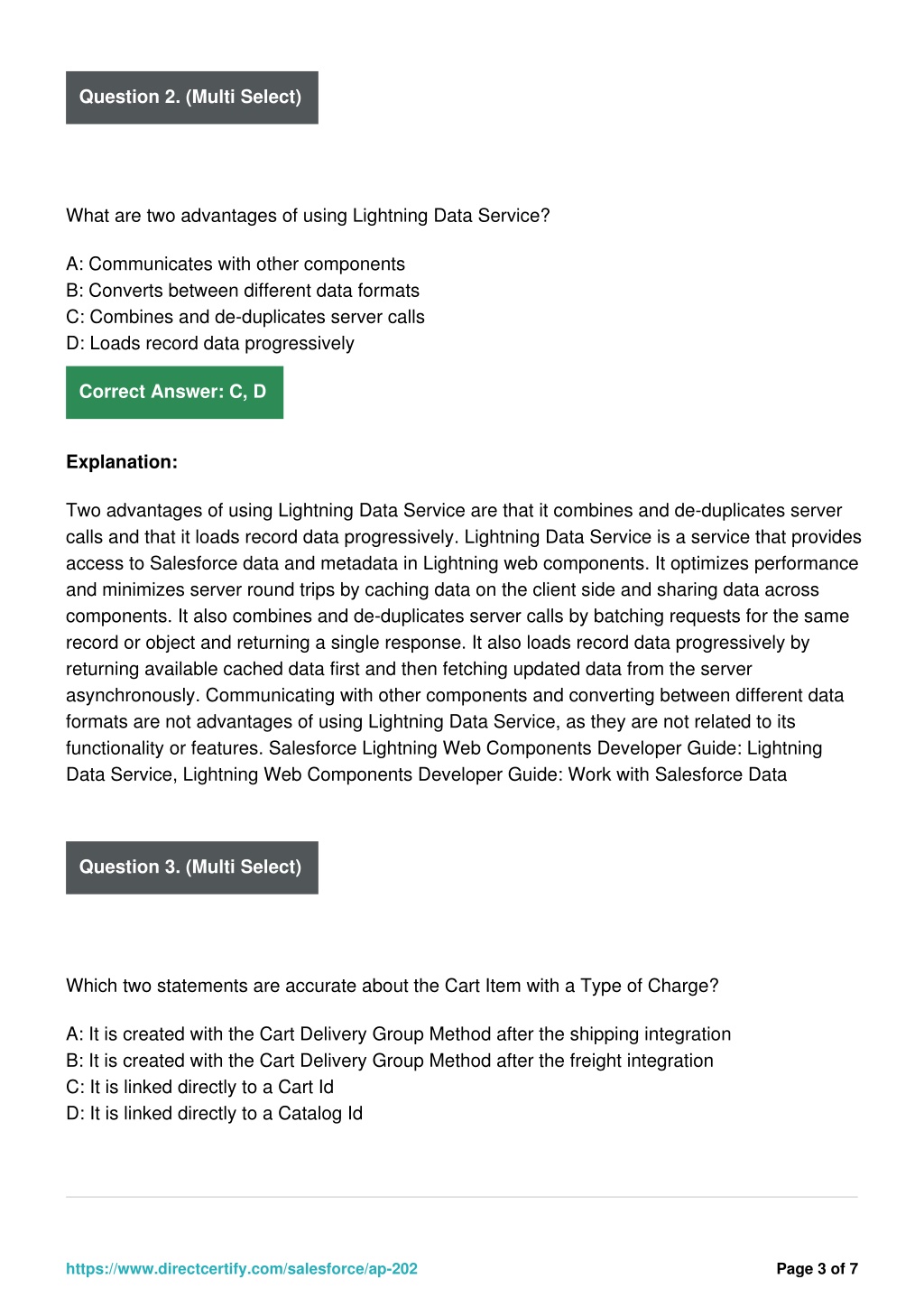 Question 2. (Multi Select) What are two advantages of using Lightning Data Service? A: Communicates with other components B: Converts between different data formats C: Combines and de-duplicates server calls D: Loads record data progressively Correct Answer: C, D Explanation: Two advantages of using Lightning Data Service are that it combines and de-duplicates server calls and that it loads record data progressively. Lightning Data Service is a service that provides access to Salesforce data and metadata in Lightning web components. It optimizes performance and minimizes server round trips by caching data on the client side and sharing data across components. It also combines and de-duplicates server calls by batching requests for the same record or object and returning a single response. It also loads record data progressively by returning available cached data first and then fetching updated data from the server asynchronously. Communicating with other components and converting between different data formats are not advantages of using Lightning Data Service, as they are not related to its functionality or features. Salesforce Lightning Web Components Developer Guide: Lightning Data Service, Lightning Web Components Developer Guide: Work with Salesforce Data Question 3. (Multi Select) Which two statements are accurate about the Cart Item with a Type of Charge? A: It is created with the Cart Delivery Group Method after the shipping integration B: It is created with the Cart Delivery Group Method after the freight integration C: It is linked directly to a Cart Id D: It is linked directly to a Catalog Id https://www.directcertify.com/salesforce/ap-202 Page 3 of 7