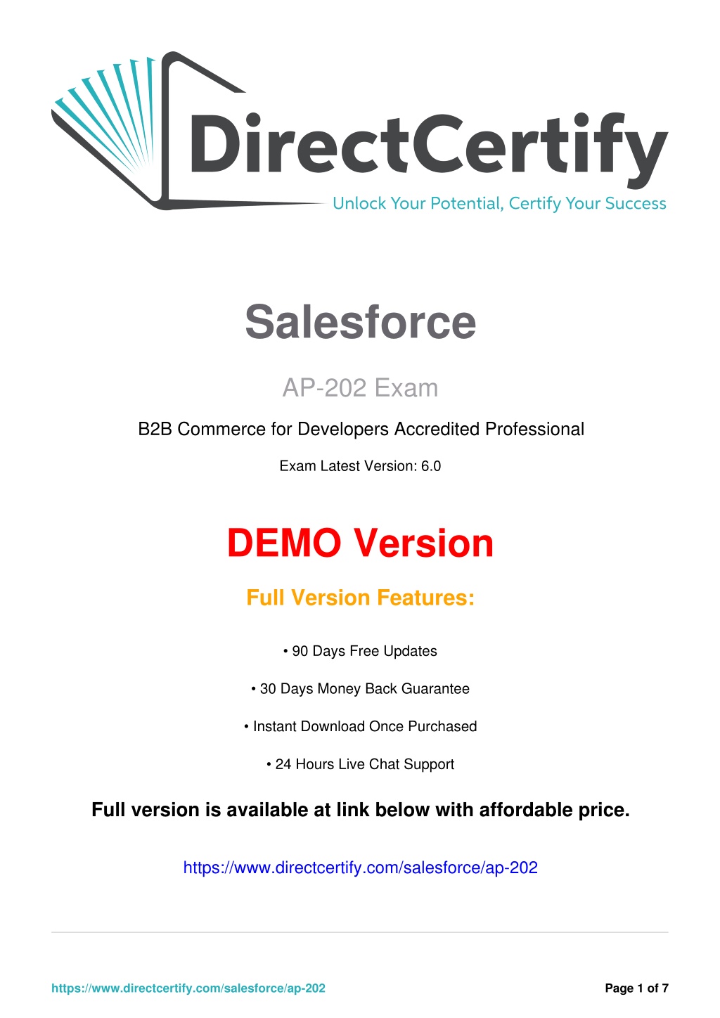 Salesforce AP-202 Exam B2B Commerce for Developers Accredited Professional Exam Latest Version: 6.0 DEMO Version Full Version Features: • 90 Days Free Updates • 30 Days Money Back Guarantee • Instant Download Once Purchased • 24 Hours Live Chat Support Full version is available at link below with affordable price. https://www.directcertify.com/salesforce/ap-202 https://www.directcertify.com/salesforce/ap-202 Page 1 of 7