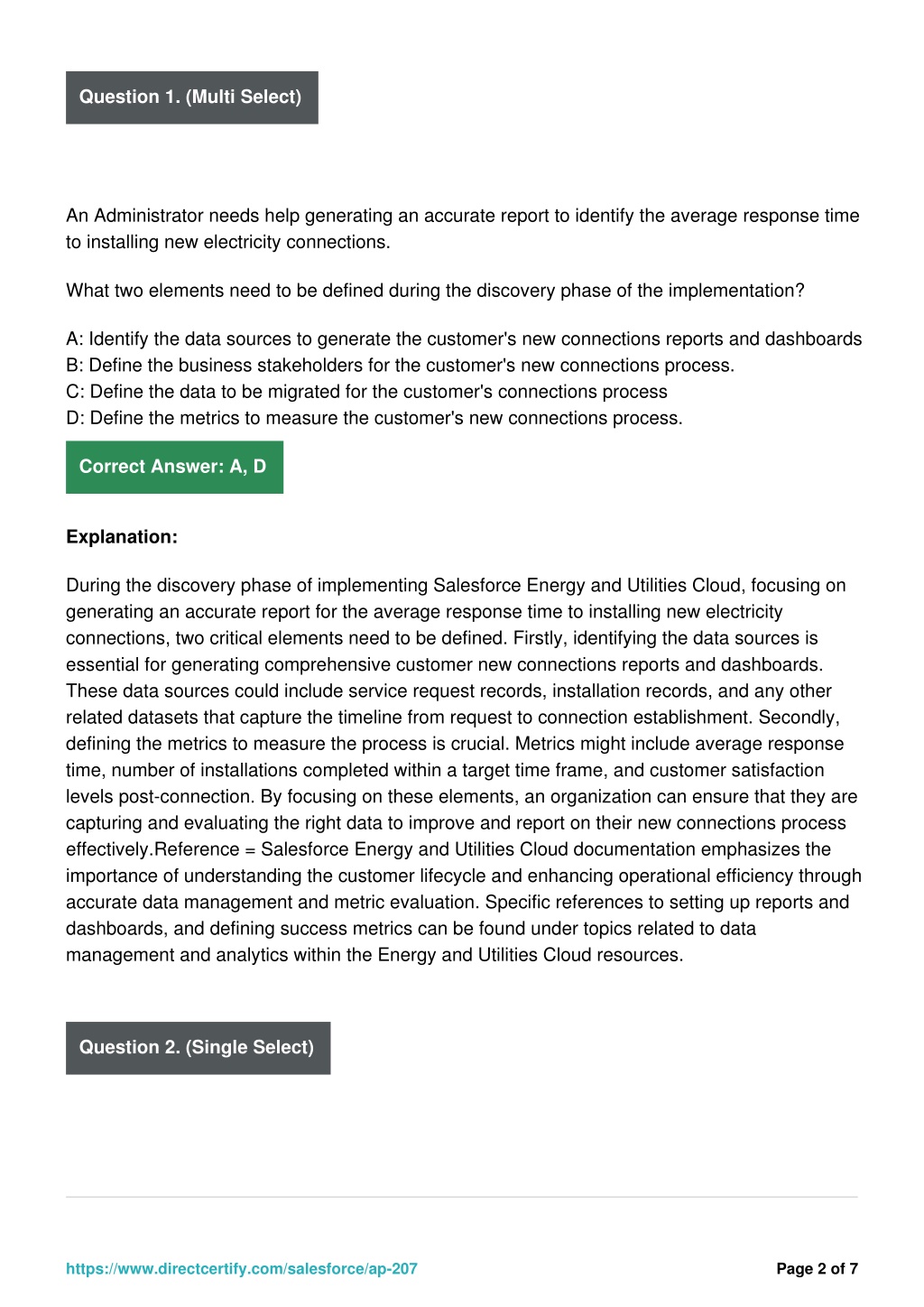 Question 1. (Multi Select) An Administrator needs help generating an accurate report to identify the average response time to installing new electricity connections. What two elements need to be defined during the discovery phase of the implementation? A: Identify the data sources to generate the customer's new connections reports and dashboards B: Define the business stakeholders for the customer's new connections process. C: Define the data to be migrated for the customer's connections process D: Define the metrics to measure the customer's new connections process. Correct Answer: A, D Explanation: During the discovery phase of implementing Salesforce Energy and Utilities Cloud, focusing on generating an accurate report for the average response time to installing new electricity connections, two critical elements need to be defined. Firstly, identifying the data sources is essential for generating comprehensive customer new connections reports and dashboards. These data sources could include service request records, installation records, and any other related datasets that capture the timeline from request to connection establishment. Secondly, defining the metrics to measure the process is crucial. Metrics might include average response time, number of installations completed within a target time frame, and customer satisfaction levels post-connection. By focusing on these elements, an organization can ensure that they are capturing and evaluating the right data to improve and report on their new connections process effectively.Reference = Salesforce Energy and Utilities Cloud documentation emphasizes the importance of understanding the customer lifecycle and enhancing operational efficiency through accurate data management and metric evaluation. Specific references to setting up reports and dashboards, and defining success metrics can be found under topics related to data management and analytics within the Energy and Utilities Cloud resources. Question 2. (Single Select) https://www.directcertify.com/salesforce/ap-207 Page 2 of 7