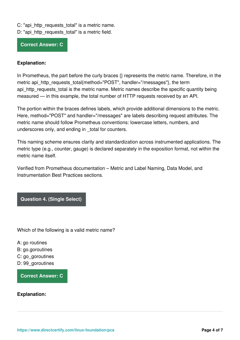 C: "api_http_requests_total" is a metric name. D: "api_http_requests_total" is a metric field. Correct Answer: C Explanation: In Prometheus, the part before the curly braces {} represents the metric name. Therefore, in the metric api_http_requests_total{method="POST", handler="/messages"}, the term api_http_requests_total is the metric name. Metric names describe the specific quantity being measured — in this example, the total number of HTTP requests received by an API. The portion within the braces defines labels, which provide additional dimensions to the metric. Here, method="POST" and handler="/messages" are labels describing request attributes. The metric name should follow Prometheus conventions: lowercase letters, numbers, and underscores only, and ending in _total for counters. This naming scheme ensures clarity and standardization across instrumented applications. The metric type (e.g., counter, gauge) is declared separately in the exposition format, not within the metric name itself. Verified from Prometheus documentation – Metric and Label Naming, Data Model, and Instrumentation Best Practices sections. Question 4. (Single Select) Which of the following is a valid metric name? A: go routines B: go.goroutines C: go_goroutines D: 99_goroutines Correct Answer: C Explanation: https://www.directcertify.com/linux-foundation/pca Page 4 of 7