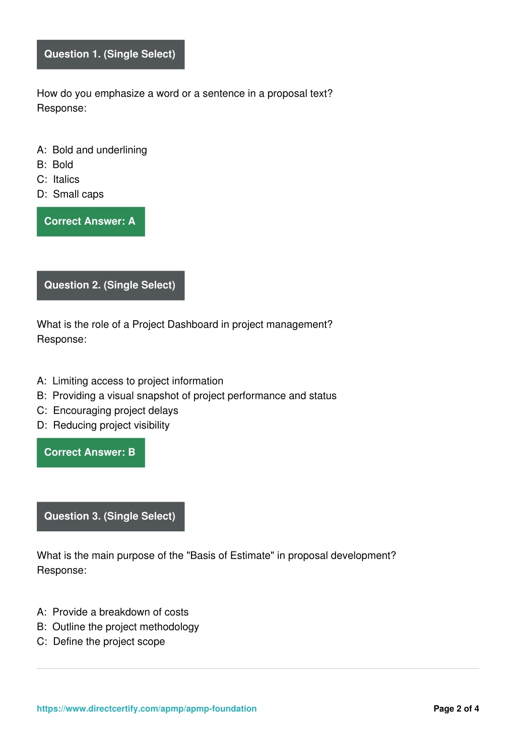 Question 1. (Single Select) How do you emphasize a word or a sentence in a proposal text? Response: A: Bold and underlining B: Bold C: Italics D: Small caps Correct Answer: A Question 2. (Single Select) What is the role of a Project Dashboard in project management? Response: A: Limiting access to project information B: Providing a visual snapshot of project performance and status C: Encouraging project delays D: Reducing project visibility Correct Answer: B Question 3. (Single Select) What is the main purpose of the "Basis of Estimate" in proposal development? Response: A: Provide a breakdown of costs B: Outline the project methodology C: Define the project scope https://www.directcertify.com/apmp/apmp-foundation Page 2 of 4