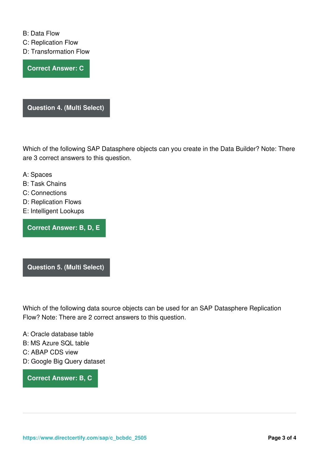 B: Data Flow C: Replication Flow D: Transformation Flow Correct Answer: C Question 4. (Multi Select) Which of the following SAP Datasphere objects can you create in the Data Builder? Note: There are 3 correct answers to this question. A: Spaces B: Task Chains C: Connections D: Replication Flows E: Intelligent Lookups Correct Answer: B, D, E Question 5. (Multi Select) Which of the following data source objects can be used for an SAP Datasphere Replication Flow? Note: There are 2 correct answers to this question. A: Oracle database table B: MS Azure SQL table C: ABAP CDS view D: Google Big Query dataset Correct Answer: B, C https://www.directcertify.com/sap/c_bcbdc_2505 Page 3 of 4