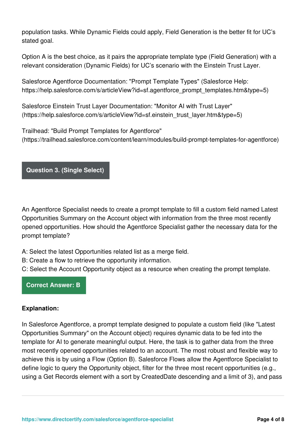 population tasks. While Dynamic Fields could apply, Field Generation is the better fit for UC’s stated goal. Option A is the best choice, as it pairs the appropriate template type (Field Generation) with a relevant consideration (Dynamic Fields) for UC’s scenario with the Einstein Trust Layer. Salesforce Agentforce Documentation: "Prompt Template Types" (Salesforce Help: https://help.salesforce.com/s/articleView?id=sf.agentforce_prompt_templates.htm&type=5) Salesforce Einstein Trust Layer Documentation: "Monitor AI with Trust Layer" (https://help.salesforce.com/s/articleView?id=sf.einstein_trust_layer.htm&type=5) Trailhead: "Build Prompt Templates for Agentforce" (https://trailhead.salesforce.com/content/learn/modules/build-prompt-templates-for-agentforce) Question 3. (Single Select) An Agentforce Specialist needs to create a prompt template to fill a custom field named Latest Opportunities Summary on the Account object with information from the three most recently opened opportunities. How should the Agentforce Specialist gather the necessary data for the prompt template? A: Select the latest Opportunities related list as a merge field. B: Create a flow to retrieve the opportunity information. C: Select the Account Opportunity object as a resource when creating the prompt template. Correct Answer: B Explanation: In Salesforce Agentforce, a prompt template designed to populate a custom field (like "Latest Opportunities Summary" on the Account object) requires dynamic data to be fed into the template for AI to generate meaningful output. Here, the task is to gather data from the three most recently opened opportunities related to an account. The most robust and flexible way to achieve this is by using a Flow (Option B). Salesforce Flows allow the Agentforce Specialist to define logic to query the Opportunity object, filter for the three most recent opportunities (e.g., using a Get Records element with a sort by CreatedDate descending and a limit of 3), and pass https://www.directcertify.com/salesforce/agentforce-specialist Page 4 of 8