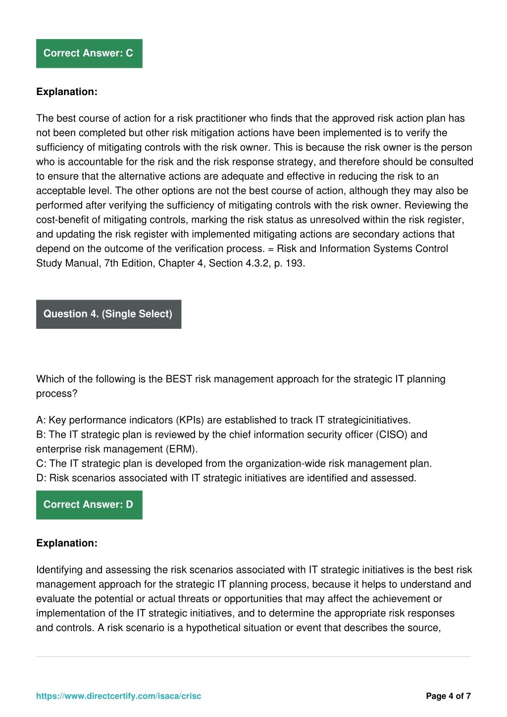 Correct Answer: C Explanation: The best course of action for a risk practitioner who finds that the approved risk action plan has not been completed but other risk mitigation actions have been implemented is to verify the sufficiency of mitigating controls with the risk owner. This is because the risk owner is the person who is accountable for the risk and the risk response strategy, and therefore should be consulted to ensure that the alternative actions are adequate and effective in reducing the risk to an acceptable level. The other options are not the best course of action, although they may also be performed after verifying the sufficiency of mitigating controls with the risk owner. Reviewing the cost-benefit of mitigating controls, marking the risk status as unresolved within the risk register, and updating the risk register with implemented mitigating actions are secondary actions that depend on the outcome of the verification process. = Risk and Information Systems Control Study Manual, 7th Edition, Chapter 4, Section 4.3.2, p. 193. Question 4. (Single Select) Which of the following is the BEST risk management approach for the strategic IT planning process? A: Key performance indicators (KPIs) are established to track IT strategicinitiatives. B: The IT strategic plan is reviewed by the chief information security officer (CISO) and enterprise risk management (ERM). C: The IT strategic plan is developed from the organization-wide risk management plan. D: Risk scenarios associated with IT strategic initiatives are identified and assessed. Correct Answer: D Explanation: Identifying and assessing the risk scenarios associated with IT strategic initiatives is the best risk management approach for the strategic IT planning process, because it helps to understand and evaluate the potential or actual threats or opportunities that may affect the achievement or implementation of the IT strategic initiatives, and to determine the appropriate risk responses and controls. A risk scenario is a hypothetical situation or event that describes the source, https://www.directcertify.com/isaca/crisc Page 4 of 7