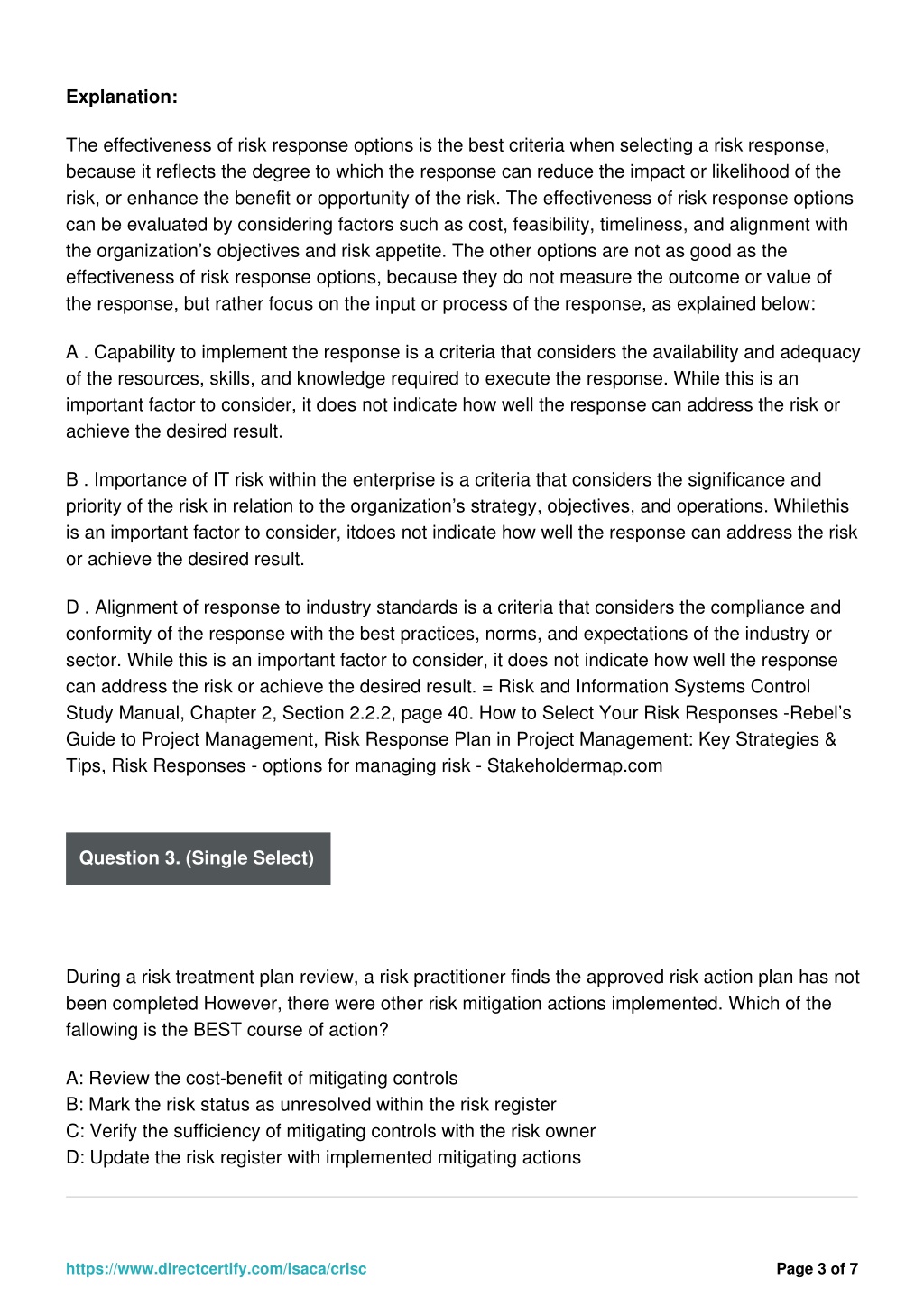 Explanation: The effectiveness of risk response options is the best criteria when selecting a risk response, because it reflects the degree to which the response can reduce the impact or likelihood of the risk, or enhance the benefit or opportunity of the risk. The effectiveness of risk response options can be evaluated by considering factors such as cost, feasibility, timeliness, and alignment with the organization’s objectives and risk appetite. The other options are not as good as the effectiveness of risk response options, because they do not measure the outcome or value of the response, but rather focus on the input or process of the response, as explained below: A . Capability to implement the response is a criteria that considers the availability and adequacy of the resources, skills, and knowledge required to execute the response. While this is an important factor to consider, it does not indicate how well the response can address the risk or achieve the desired result. B . Importance of IT risk within the enterprise is a criteria that considers the significance and priority of the risk in relation to the organization’s strategy, objectives, and operations. Whilethis is an important factor to consider, itdoes not indicate how well the response can address the risk or achieve the desired result. D . Alignment of response to industry standards is a criteria that considers the compliance and conformity of the response with the best practices, norms, and expectations of the industry or sector. While this is an important factor to consider, it does not indicate how well the response can address the risk or achieve the desired result. = Risk and Information Systems Control Study Manual, Chapter 2, Section 2.2.2, page 40. How to Select Your Risk Responses -Rebel’s Guide to Project Management, Risk Response Plan in Project Management: Key Strategies & Tips, Risk Responses - options for managing risk - Stakeholdermap.com Question 3. (Single Select) During a risk treatment plan review, a risk practitioner finds the approved risk action plan has not been completed However, there were other risk mitigation actions implemented. Which of the fallowing is the BEST course of action? A: Review the cost-benefit of mitigating controls B: Mark the risk status as unresolved within the risk register C: Verify the sufficiency of mitigating controls with the risk owner D: Update the risk register with implemented mitigating actions https://www.directcertify.com/isaca/crisc Page 3 of 7