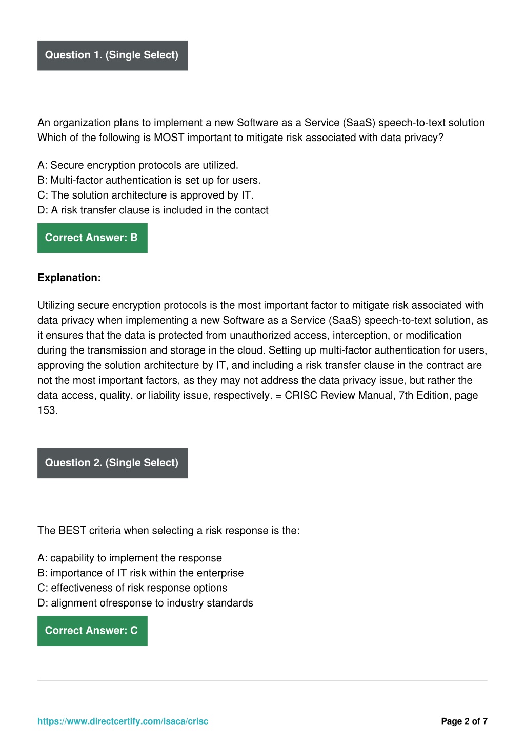 Question 1. (Single Select) An organization plans to implement a new Software as a Service (SaaS) speech-to-text solution Which of the following is MOST important to mitigate risk associated with data privacy? A: Secure encryption protocols are utilized. B: Multi-factor authentication is set up for users. C: The solution architecture is approved by IT. D: A risk transfer clause is included in the contact Correct Answer: B Explanation: Utilizing secure encryption protocols is the most important factor to mitigate risk associated with data privacy when implementing a new Software as a Service (SaaS) speech-to-text solution, as it ensures that the data is protected from unauthorized access, interception, or modification during the transmission and storage in the cloud. Setting up multi-factor authentication for users, approving the solution architecture by IT, and including a risk transfer clause in the contract are not the most important factors, as they may not address the data privacy issue, but rather the data access, quality, or liability issue, respectively. = CRISC Review Manual, 7th Edition, page 153. Question 2. (Single Select) The BEST criteria when selecting a risk response is the: A: capability to implement the response B: importance of IT risk within the enterprise C: effectiveness of risk response options D: alignment ofresponse to industry standards Correct Answer: C https://www.directcertify.com/isaca/crisc Page 2 of 7