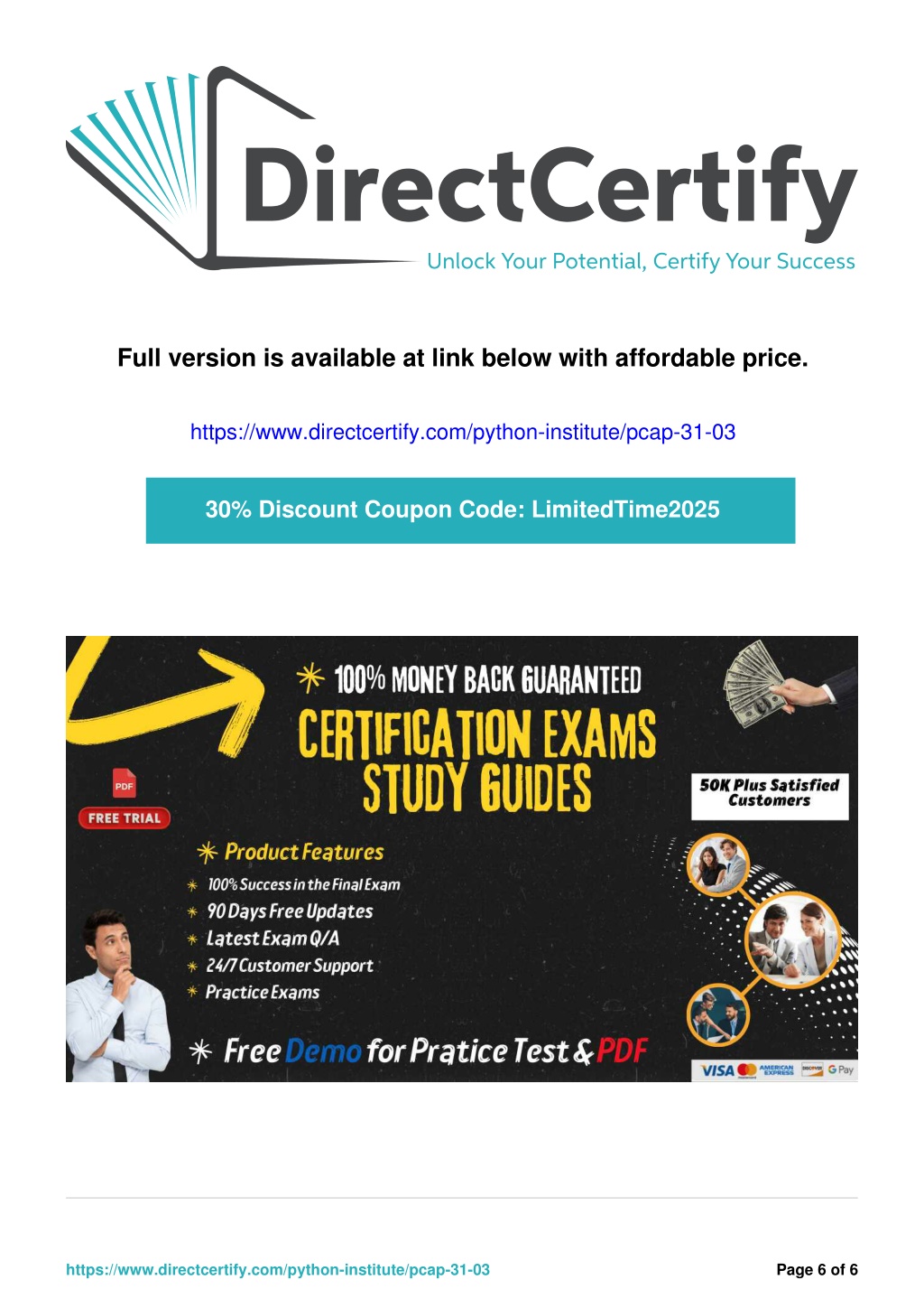 Full version is available at link below with affordable price. https://www.directcertify.com/python-institute/pcap-31-03 30% Discount Coupon Code: LimitedTime2025 https://www.directcertify.com/python-institute/pcap-31-03 Page 6 of 6