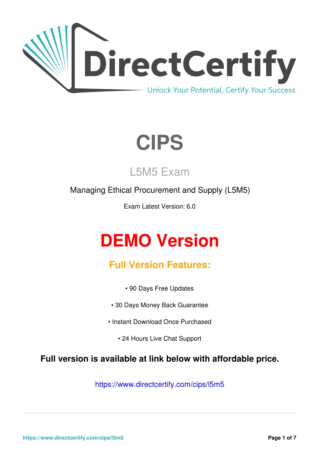 CIPS L5M5 Exam Managing Ethical Procurement and Supply (L5M5) Exam Latest Version: 6.0 DEMO Version Full Version Features: • 90 Days Free Updates • 30 Days Money Back Guarantee • Instant Download Once Purchased • 24 Hours Live Chat Support Full version is available at link below with affordable price. https://www.directcertify.com/cips/l5m5 https://www.directcertify.com/cips/l5m5 Page 1 of 7