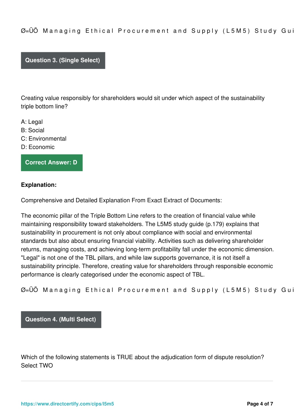 Ø=ÜÖ? ?M?a?n?a?g?i?n?g? ?E?t?h?i?c?a?l? ?P?r?o?c?u?r?e?m?e?n?t? ?a?n?d? ?S?u?p?p?l?y? ?(?L?5?M?5?)? ?S?t?u?d?y? ?G?u?i?d?e?,? ?p?.?3 Question 3. (Single Select) Creating value responsibly for shareholders would sit under which aspect of the sustainability triple bottom line? A: Legal B: Social C: Environmental D: Economic Correct Answer: D Explanation: Comprehensive and Detailed Explanation From Exact Extract of Documents: The economic pillar of the Triple Bottom Line refers to the creation of financial value while maintaining responsibility toward stakeholders. The L5M5 study guide (p.179) explains that sustainability in procurement is not only about compliance with social and environmental standards but also about ensuring financial viability. Activities such as delivering shareholder returns, managing costs, and achieving long-term profitability fall under the economic dimension. "Legal" is not one of the TBL pillars, and while law supports governance, it is not itself a sustainability principle. Therefore, creating value for shareholders through responsible economic performance is clearly categorised under the economic aspect of TBL. Ø=ÜÖ? ?M?a?n?a?g?i?n?g? ?E?t?h?i?c?a?l? ?P?r?o?c?u?r?e?m?e?n?t? ?a?n?d? ?S?u?p?p?l?y? ?(?L?5?M?5?)? ?S?t?u?d?y? ?G?u?i?d?e?,? ?p?.?1?7?9 Question 4. (Multi Select) Which of the following statements is TRUE about the adjudication form of dispute resolution? Select TWO https://www.directcertify.com/cips/l5m5 Page 4 of 7