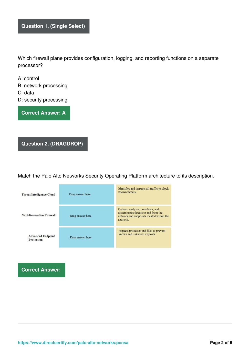 Question 1. (Single Select) Which firewall plane provides configuration, logging, and reporting functions on a separate processor? A: control B: network processing C: data D: security processing Correct Answer: A Question 2. (DRAGDROP) Match the Palo Alto Networks Security Operating Platform architecture to its description. Correct Answer: https://www.directcertify.com/palo-alto-networks/pcnsa Page 2 of 6