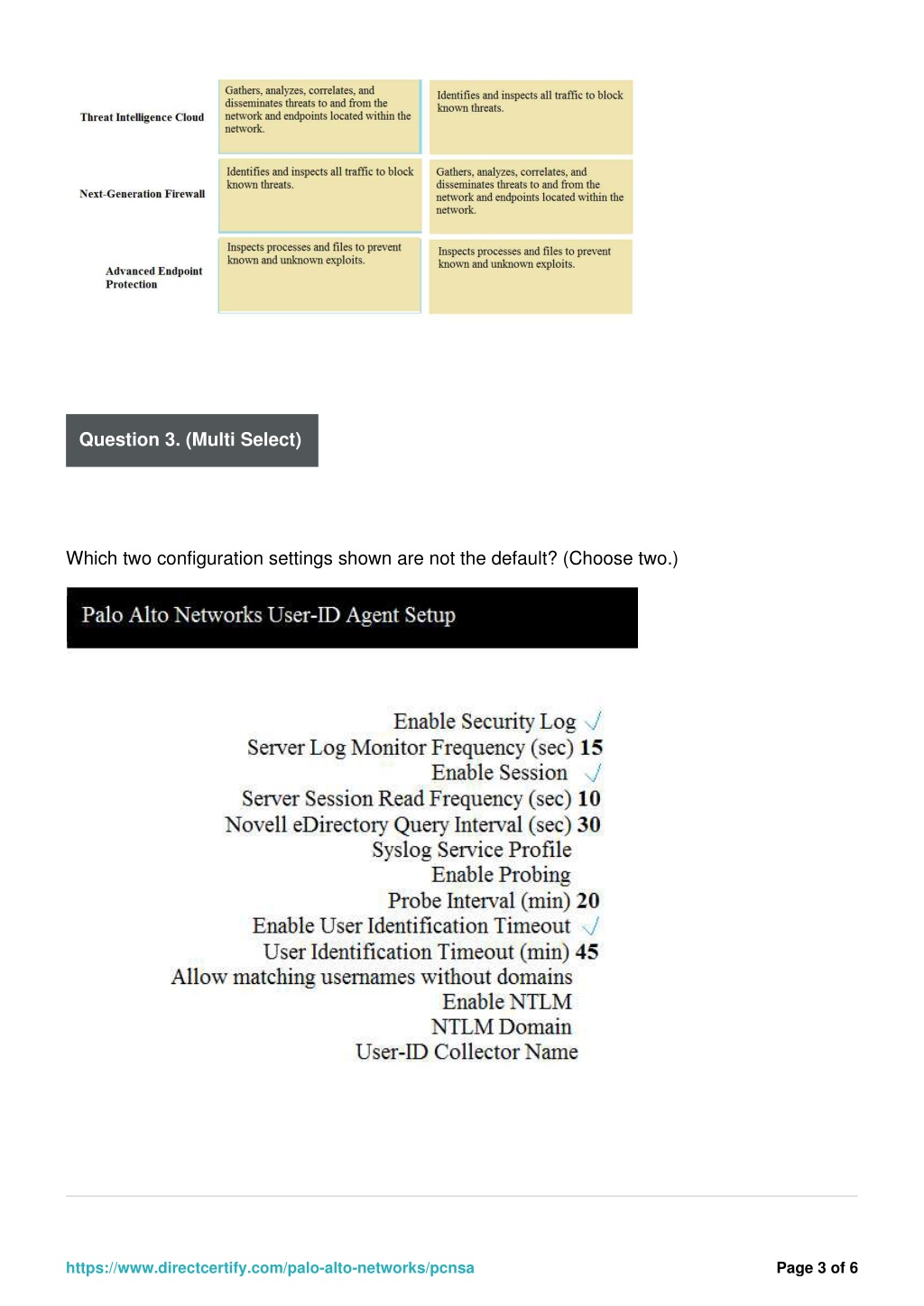 Question 3. (Multi Select) Which two configuration settings shown are not the default? (Choose two.) https://www.directcertify.com/palo-alto-networks/pcnsa Page 3 of 6