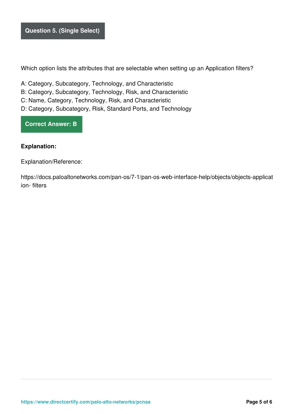 Question 5. (Single Select) Which option lists the attributes that are selectable when setting up an Application filters? A: Category, Subcategory, Technology, and Characteristic B: Category, Subcategory, Technology, Risk, and Characteristic C: Name, Category, Technology, Risk, and Characteristic D: Category, Subcategory, Risk, Standard Ports, and Technology Correct Answer: B Explanation: Explanation/Reference: https://docs.paloaltonetworks.com/pan-os/7-1/pan-os-web-interface-help/objects/objects-applicat ion- filters https://www.directcertify.com/palo-alto-networks/pcnsa Page 5 of 6