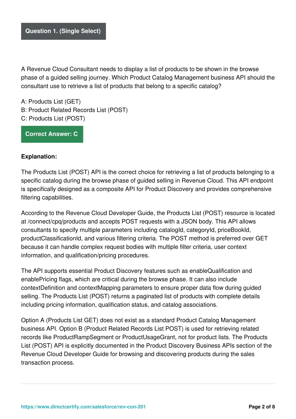 Question 1. (Single Select) A Revenue Cloud Consultant needs to display a list of products to be shown in the browse phase of a guided selling journey. Which Product Catalog Management business API should the consultant use to retrieve a list of products that belong to a specific catalog? A: Products List (GET) B: Product Related Records List (POST) C: Products List (POST) Correct Answer: C Explanation: The Products List (POST) API is the correct choice for retrieving a list of products belonging to a specific catalog during the browse phase of guided selling in Revenue Cloud. This API endpoint is specifically designed as a composite API for Product Discovery and provides comprehensive filtering capabilities. According to the Revenue Cloud Developer Guide, the Products List (POST) resource is located at /connect/cpq/products and accepts POST requests with a JSON body. This API allows consultants to specify multiple parameters including catalogId, categoryId, priceBookId, productClassificationId, and various filtering criteria. The POST method is preferred over GET because it can handle complex request bodies with multiple filter criteria, user context information, and qualification/pricing procedures. The API supports essential Product Discovery features such as enableQualification and enablePricing flags, which are critical during the browse phase. It can also include contextDefinition and contextMapping parameters to ensure proper data flow during guided selling. The Products List (POST) returns a paginated list of products with complete details including pricing information, qualification status, and catalog associations. Option A (Products List GET) does not exist as a standard Product Catalog Management business API. Option B (Product Related Records List POST) is used for retrieving related records like ProductRampSegment or ProductUsageGrant, not for product lists. The Products List (POST) API is explicitly documented in the Product Discovery Business APIs section of the Revenue Cloud Developer Guide for browsing and discovering products during the sales transaction process. https://www.directcertify.com/salesforce/rev-con-201 Page 2 of 8