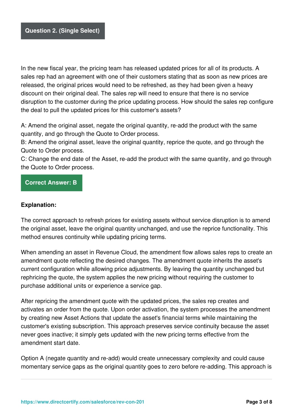 Question 2. (Single Select) In the new fiscal year, the pricing team has released updated prices for all of its products. A sales rep had an agreement with one of their customers stating that as soon as new prices are released, the original prices would need to be refreshed, as they had been given a heavy discount on their original deal. The sales rep will need to ensure that there is no service disruption to the customer during the price updating process. How should the sales rep configure the deal to pull the updated prices for this customer's assets? A: Amend the original asset, negate the original quantity, re-add the product with the same quantity, and go through the Quote to Order process. B: Amend the original asset, leave the original quantity, reprice the quote, and go through the Quote to Order process. C: Change the end date of the Asset, re-add the product with the same quantity, and go through the Quote to Order process. Correct Answer: B Explanation: The correct approach to refresh prices for existing assets without service disruption is to amend the original asset, leave the original quantity unchanged, and use the reprice functionality. This method ensures continuity while updating pricing terms. When amending an asset in Revenue Cloud, the amendment flow allows sales reps to create an amendment quote reflecting the desired changes. The amendment quote inherits the asset's current configuration while allowing price adjustments. By leaving the quantity unchanged but rephricing the quote, the system applies the new pricing without requiring the customer to purchase additional units or experience a service gap. After repricing the amendment quote with the updated prices, the sales rep creates and activates an order from the quote. Upon order activation, the system processes the amendment by creating new Asset Actions that update the asset's financial terms while maintaining the customer's existing subscription. This approach preserves service continuity because the asset never goes inactive; it simply gets updated with the new pricing terms effective from the amendment start date. Option A (negate quantity and re-add) would create unnecessary complexity and could cause momentary service gaps as the original quantity goes to zero before re-adding. This approach is https://www.directcertify.com/salesforce/rev-con-201 Page 3 of 8
