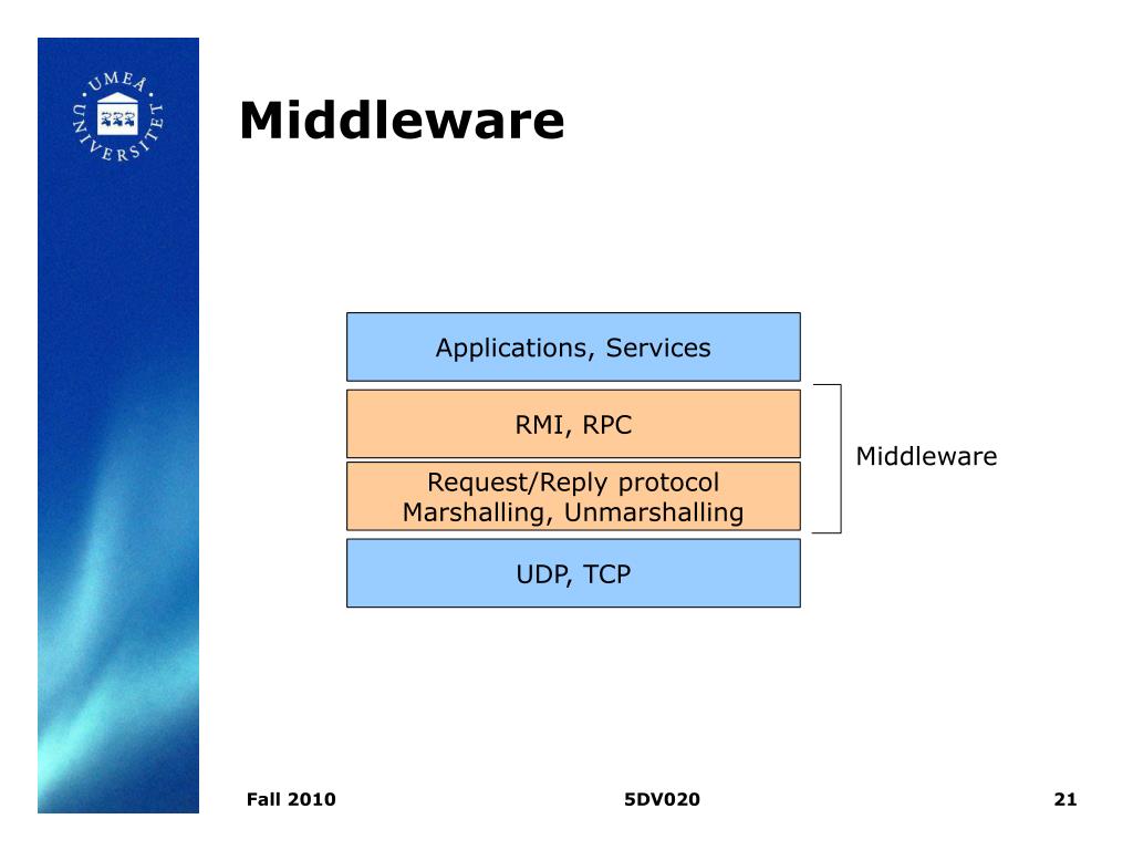 5DV020 Middleware Applications, Services RMI, RPC Middleware Request/Reply protocol Marshalling, Unmarshalling UDP, TCP