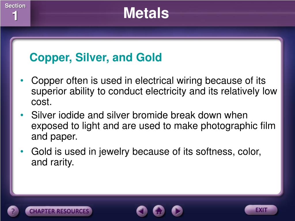 Copper, Silver, and Gold • Copper often is used in electrical wiring because of its superior ability to conduct electricity and its relatively low cost. • Silver iodide and silver bromide break down when exposed to light and are used to make photographic film and paper. • Gold is used in jewelry because of its softness, color, and rarity.