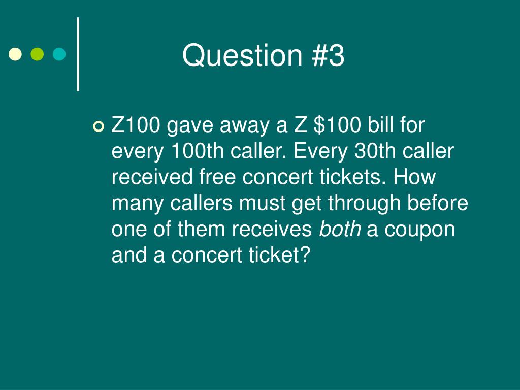 Question #3 • Z100 gave away a Z $100 bill for every 100th caller. Every 30th caller received free concert tickets. How many callers must get through before one of them receives both a coupon and a concert ticket?