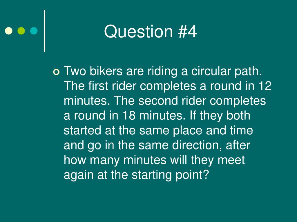 Question #4 • Two bikers are riding a circular path. The first rider completes a round in 12 minutes. The second rider completes a round in 18 minutes. If they both started at the same place and time and go in the same direction, after how many minutes will they meet again at the starting point?
