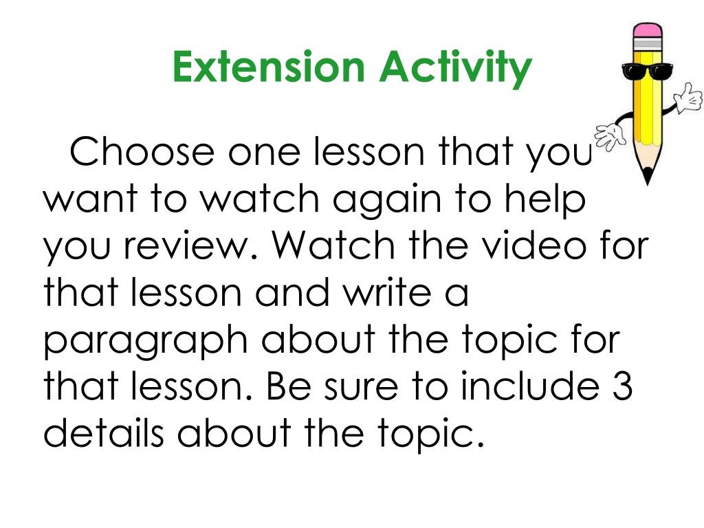 Extension Activity • Choose one lesson that you want to watch again to help you review. Watch the video for that lesson and write a paragraph about the topic for that lesson. Be sure to include 3 details about the topic.