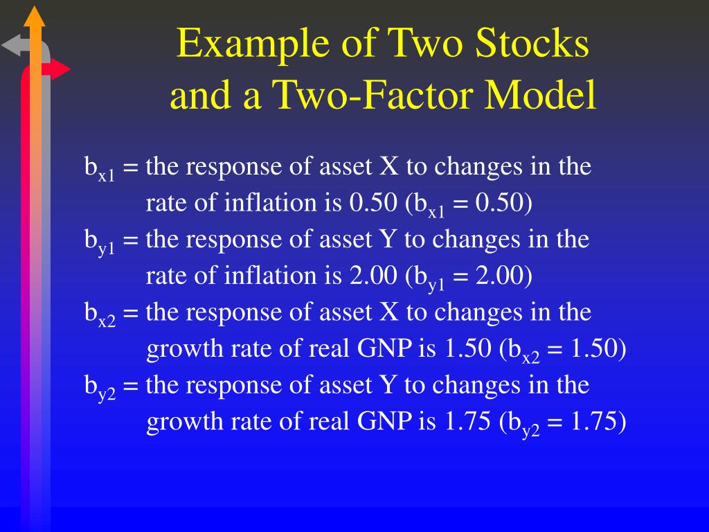 Example of Two Stocks and a Two-Factor Model bx1 = the response of asset X to changes in the rate of inflation is 0.50 (bx1 = 0.50) by1 = the response of asset Y to changes in the rate of inflation is 2.00 (by1 = 2.00) bx2 = the response of asset X to changes in the growth rate of real GNP is 1.50 (bx2 = 1.50) by2 = the response of asset Y to changes in the growth rate of real GNP is 1.75 (by2 = 1.75)