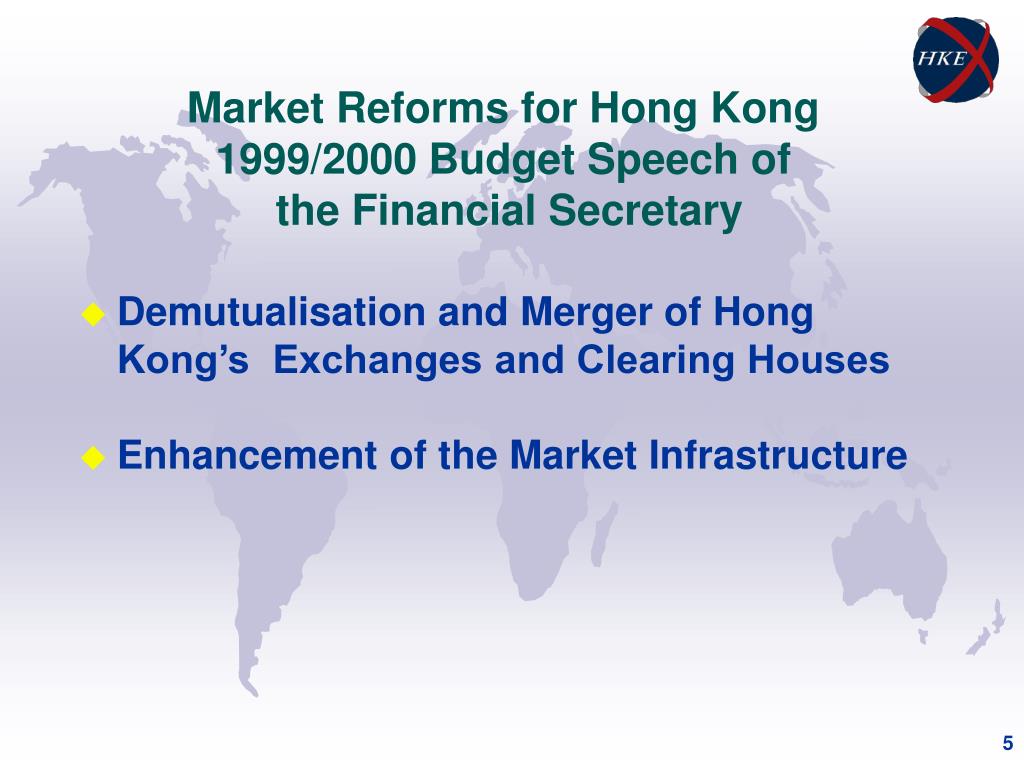 Market Reforms for Hong Kong 1999/2000 Budget Speech of the Financial Secretary • Demutualisation and Merger of Hong Kong’s Exchanges and Clearing Houses • Enhancement of the Market Infrastructure