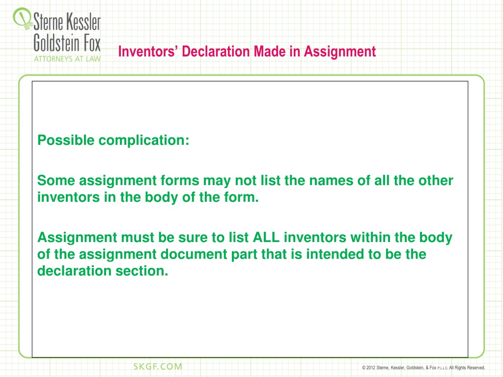 Inventors’ Declaration Made in Assignment Possible complication: Some assignment forms may not list the names of all the other inventors in the body of the form. Assignment must be sure to list ALL inventors within the body of the assignment document part that is intended to be the declaration section.