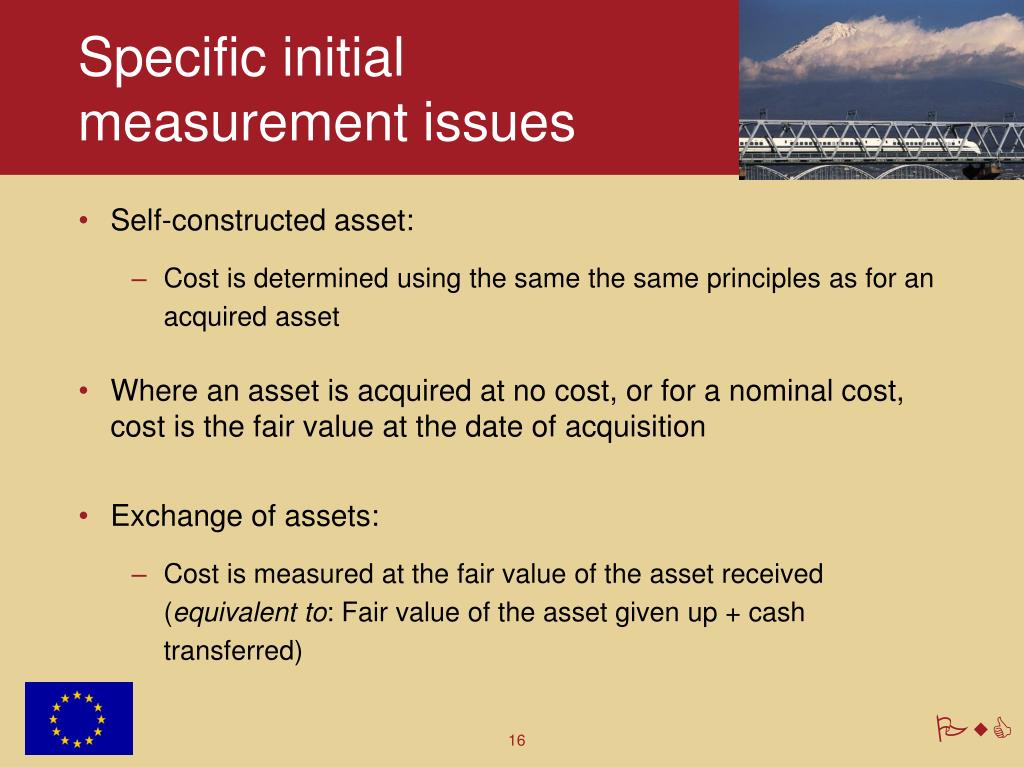 Specific initial measurement issues • Self-constructed asset: • Cost is determined using the same the same principles as for an acquired asset • Where an asset is acquired at no cost, or for a nominal cost, cost is the fair value at the date of acquisition • Exchange of assets: • Cost is measured at the fair value of the asset received (equivalent to: Fair value of the asset given up + cash transferred)
