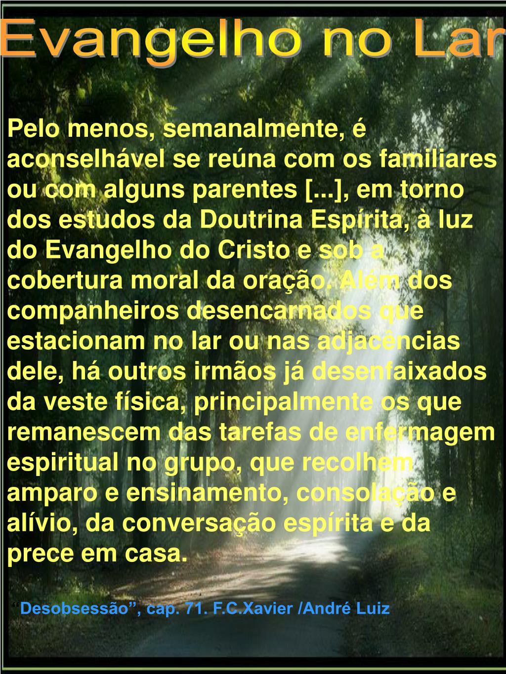 Evangelho no Lar “ Pelo menos, semanalmente, é aconselhável se reúna com os familiares ou com alguns parentes [...], em torno dos estudos da Doutrina Espírita, à luz do Evangelho do Cristo e sob a cobertura moral da oração. Além dos companheiros desencarnados que estacionam no lar ou nas adjacências dele, há outros irmãos já desenfaixados da veste física, principalmente os que remanescem das tarefas de enfermagem espiritual no grupo, que recolhem amparo e ensinamento, consolação e alívio, da conversação espírita e da prece em casa. “Desobsessão”, cap. 71. F.C.Xavier /André Luiz