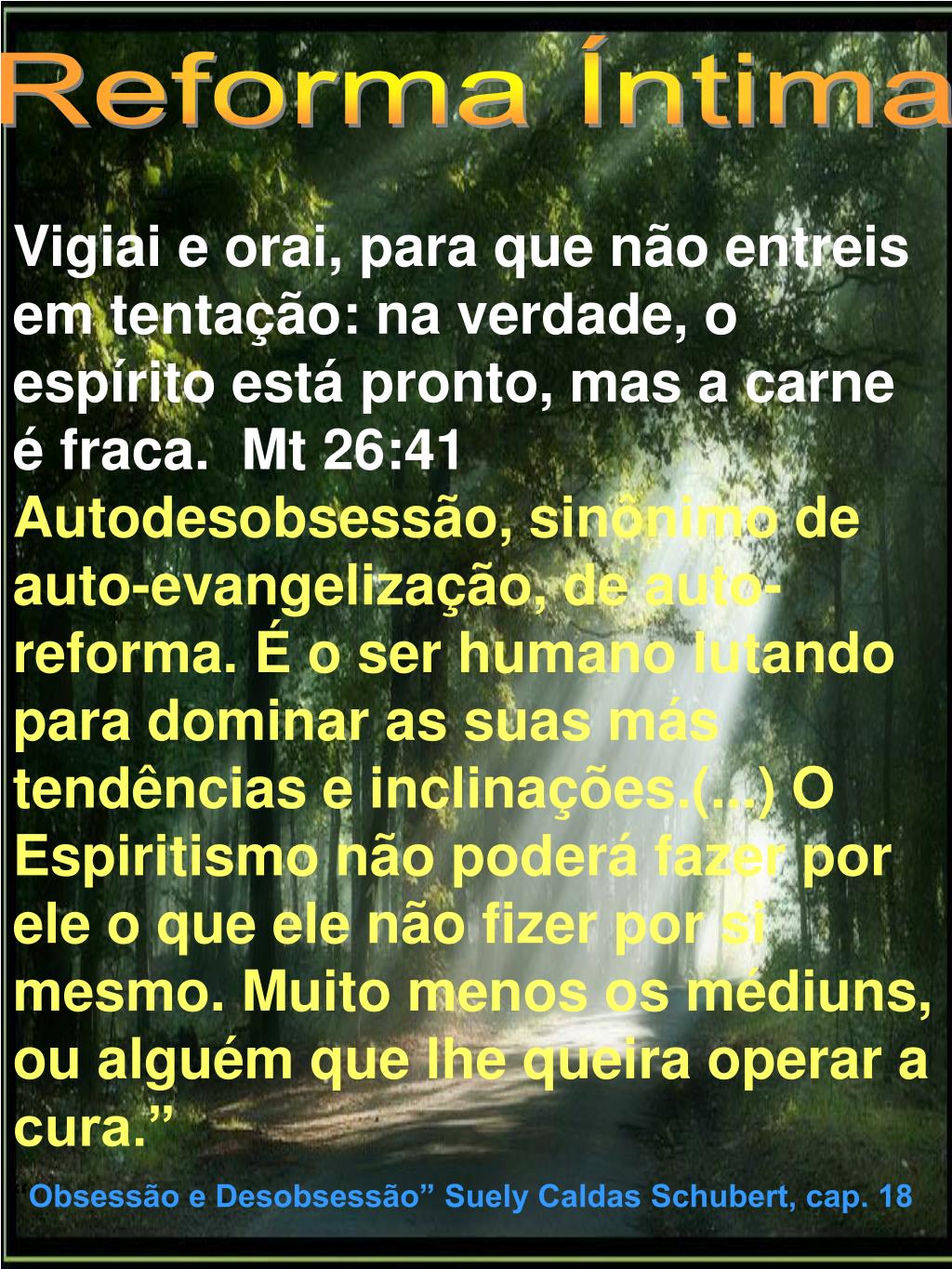 Reforma Íntima “ Vigiai e orai, para que não entreis em tentação: na verdade, o espírito está pronto, mas a carne é fraca. Mt 26:41 Autodesobsessão, sinônimo de auto-evangelização, de auto-reforma. É o ser humano lutando para dominar as suas más tendências e inclinações.(...) O Espiritismo não poderá fazer por ele o que ele não fizer por si mesmo. Muito menos os médiuns, ou alguém que lhe queira operar a cura.” “Obsessão e Desobsessão” Suely Caldas Schubert, cap. 18