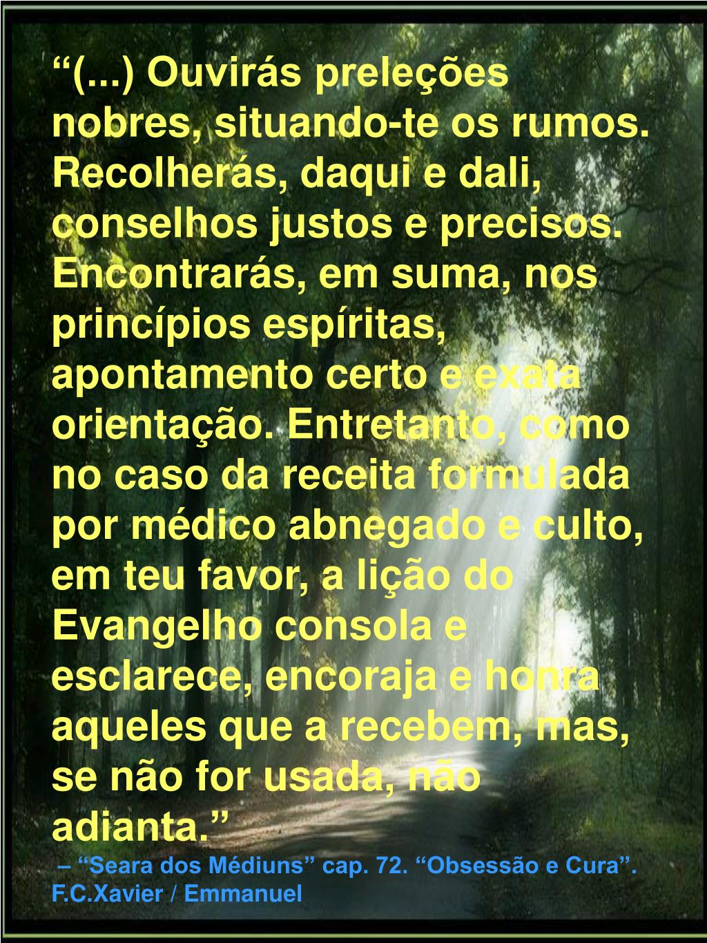 “(...) Ouvirás preleções nobres, situando-te os rumos. Recolherás, daqui e dali, conselhos justos e precisos. Encontrarás, em suma, nos princípios espíritas, apontamento certo e exata orientação. Entretanto, como no caso da receita formulada por médico abnegado e culto, em teu favor, a lição do Evangelho consola e esclarece, encoraja e honra aqueles que a recebem, mas, se não for usada, não adianta.” – “Seara dos Médiuns” cap. 72. “Obsessão e Cura”. F.C.Xavier / Emmanuel “