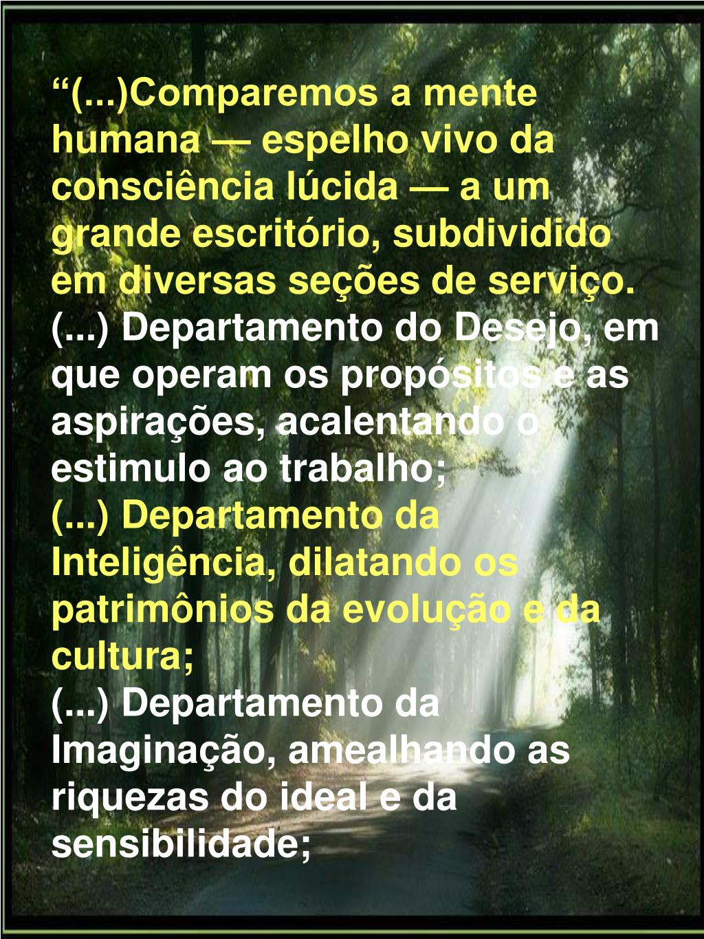 “(...)Comparemos a mente humana — espelho vivo da consciência lúcida — a um grande escritório, subdividido em diversas seções de serviço. (...) Departamento do Desejo, em que operam os propósitos e as aspirações, acalentando o estimulo ao trabalho; (...) Departamento da Inteligência, dilatando os patrimônios da evolução e da cultura; (...) Departamento da Imaginação, amealhando as riquezas do ideal e da sensibilidade; “