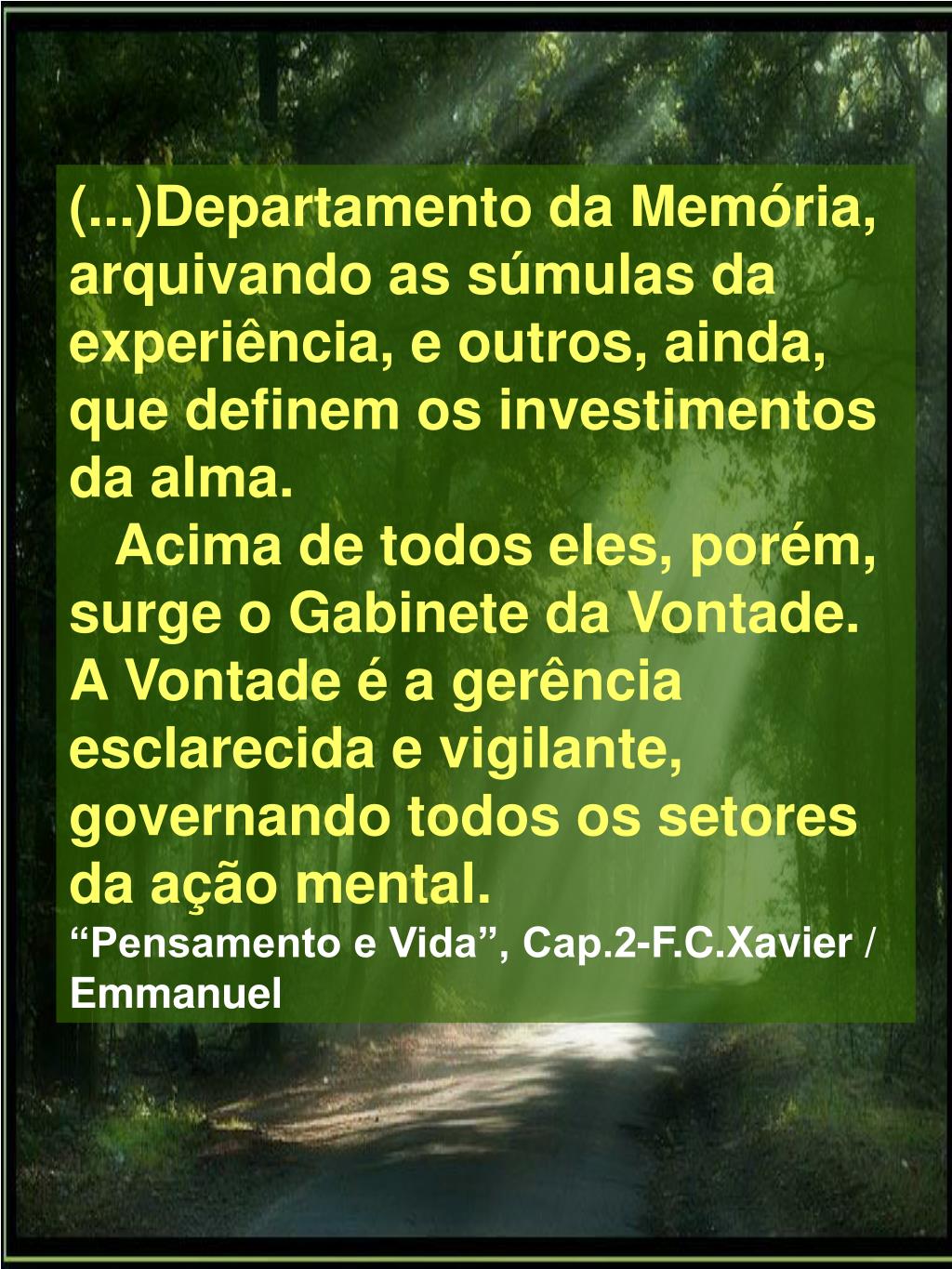 “ (...)Departamento da Memória, arquivando as súmulas da experiência, e outros, ainda, que definem os investimentos da alma. Acima de todos eles, porém, surge o Gabinete da Vontade. A Vontade é a gerência esclarecida e vigilante, governando todos os setores da ação mental. “Pensamento e Vida”, Cap.2-F.C.Xavier / Emmanuel