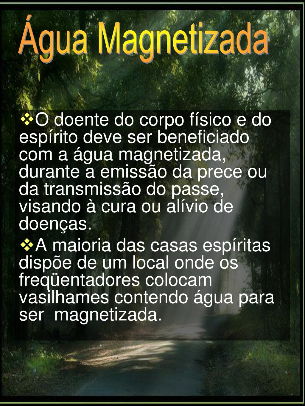 Água Magnetizada • O doente do corpo físico e do espírito deve ser beneficiado com a água magnetizada, durante a emissão da prece ou da transmissão do passe, visando à cura ou alívio de doenças. • A maioria das casas espíritas dispõe de um local onde os freqüentadores colocam vasilhames contendo água para ser magnetizada.