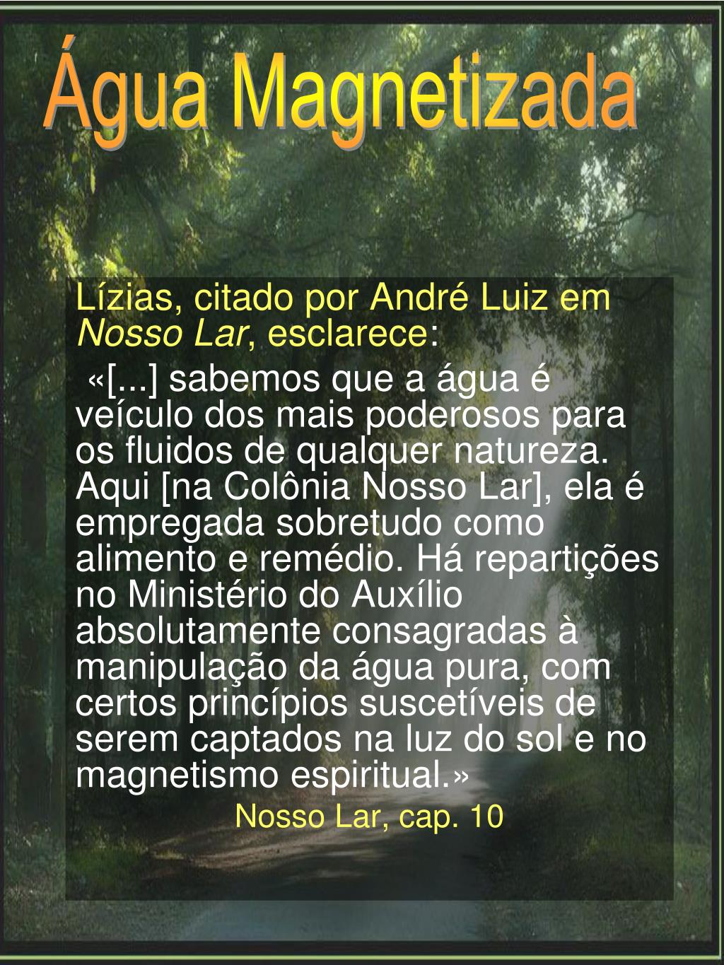 Água Magnetizada Lízias, citado por André Luiz em Nosso Lar, esclarece: «[...] sabemos que a água é veículo dos mais poderosos para os fluidos de qualquer natureza. Aqui [na Colônia Nosso Lar], ela é empregada sobretudo como alimento e remédio. Há repartições no Ministério do Auxílio absolutamente consagradas à manipulação da água pura, com certos princípios suscetíveis de serem captados na luz do sol e no magnetismo espiritual.» Nosso Lar, cap. 10