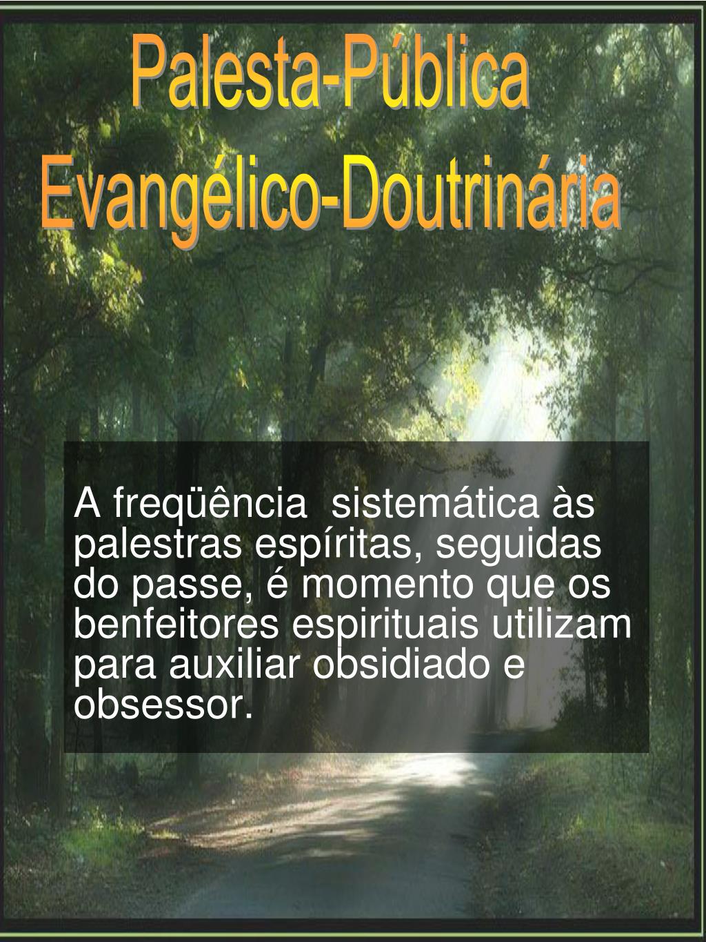 Palesta-Pública Evangélico-Doutrinária A freqüência sistemática às palestras espíritas, seguidas do passe, é momento que os benfeitores espirituais utilizam para auxiliar obsidiado e obsessor.