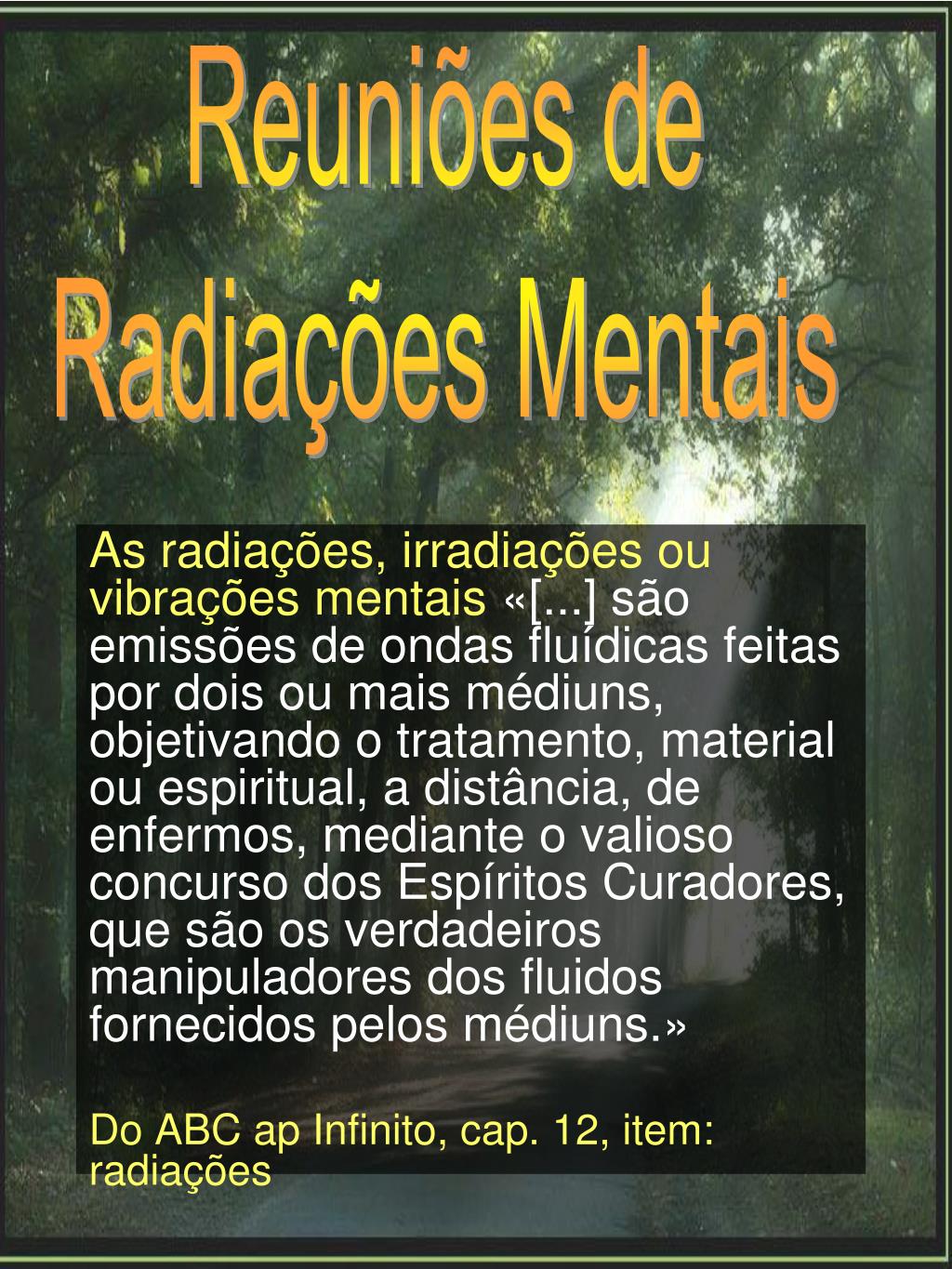 Reuniões de Radiações Mentais As radiações, irradiações ou vibrações mentais «[...] são emissões de ondas fluídicas feitas por dois ou mais médiuns, objetivando o tratamento, material ou espiritual, a distância, de enfermos, mediante o valioso concurso dos Espíritos Curadores, que são os verdadeiros manipuladores dos fluidos fornecidos pelos médiuns.» Do ABC ap Infinito, cap. 12, item: radiações