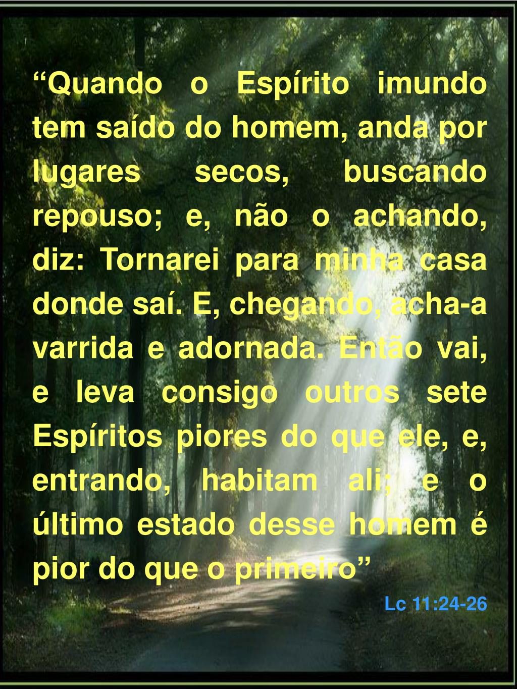 “Quando o Espírito imundo tem saído do homem, anda por lugares secos, buscando repouso; e, não o achando, diz: Tornarei para minha casa donde saí. E, chegando, acha-a varrida e adornada. Então vai, e leva consigo outros sete Espíritos piores do que ele, e, entrando, habitam ali; e o último estado desse homem é pior do que o primeiro” Lc 11:24-26
