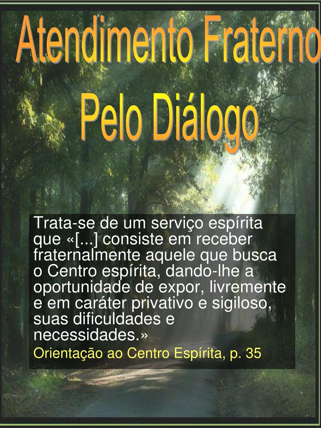 Atendimento Fraterno Pelo Diálogo Trata-se de um serviço espírita que «[...] consiste em receber fraternalmente aquele que busca o Centro espírita, dando-lhe a oportunidade de expor, livremente e em caráter privativo e sigiloso, suas dificuldades e necessidades.» Orientação ao Centro Espírita, p. 35