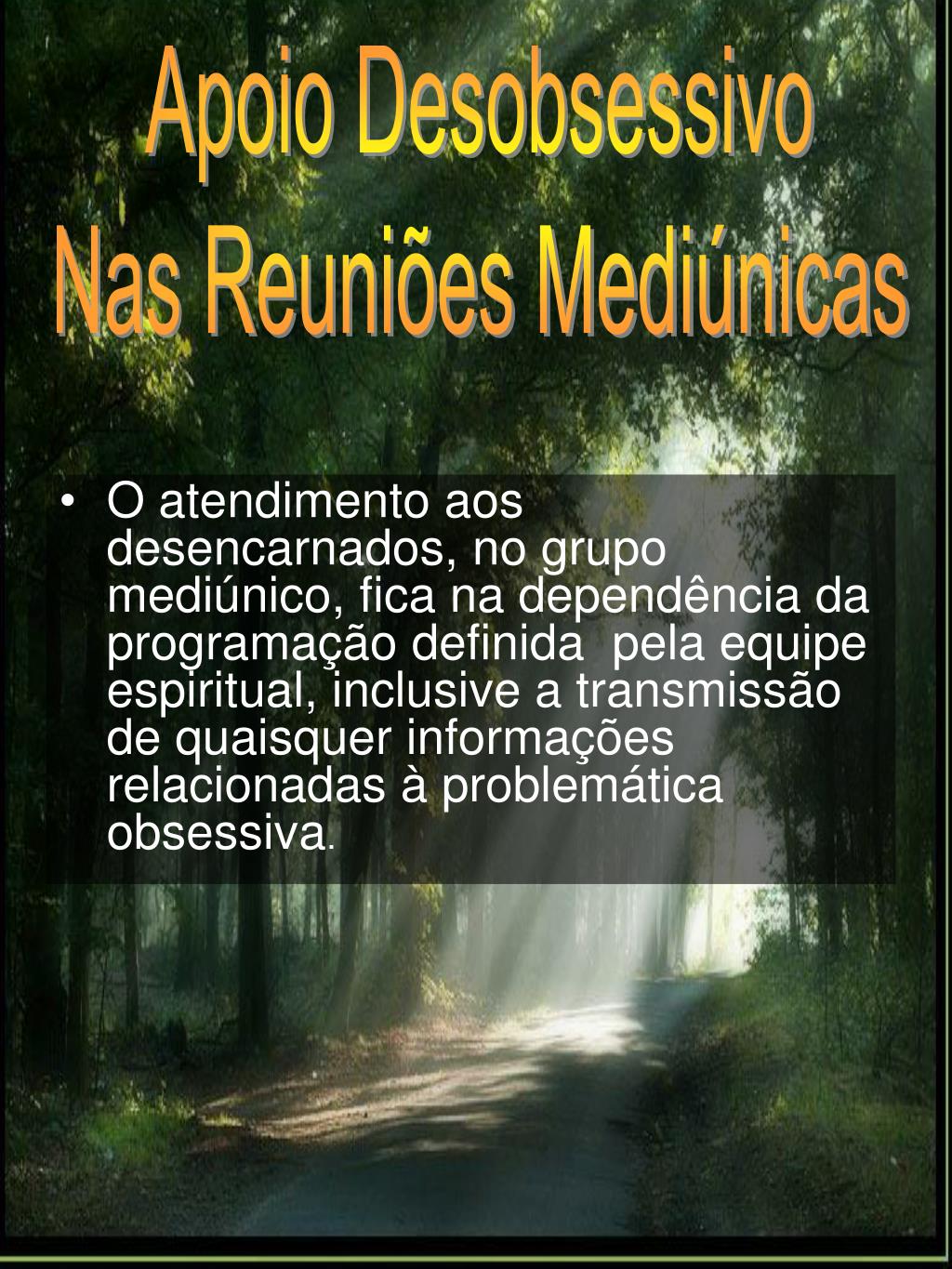 Apoio Desobsessivo Nas Reuniões Mediúnicas • O atendimento aos desencarnados, no grupo mediúnico, fica na dependência da programação definida pela equipe espiritual, inclusive a transmissão de quaisquer informações relacionadas à problemática obsessiva.