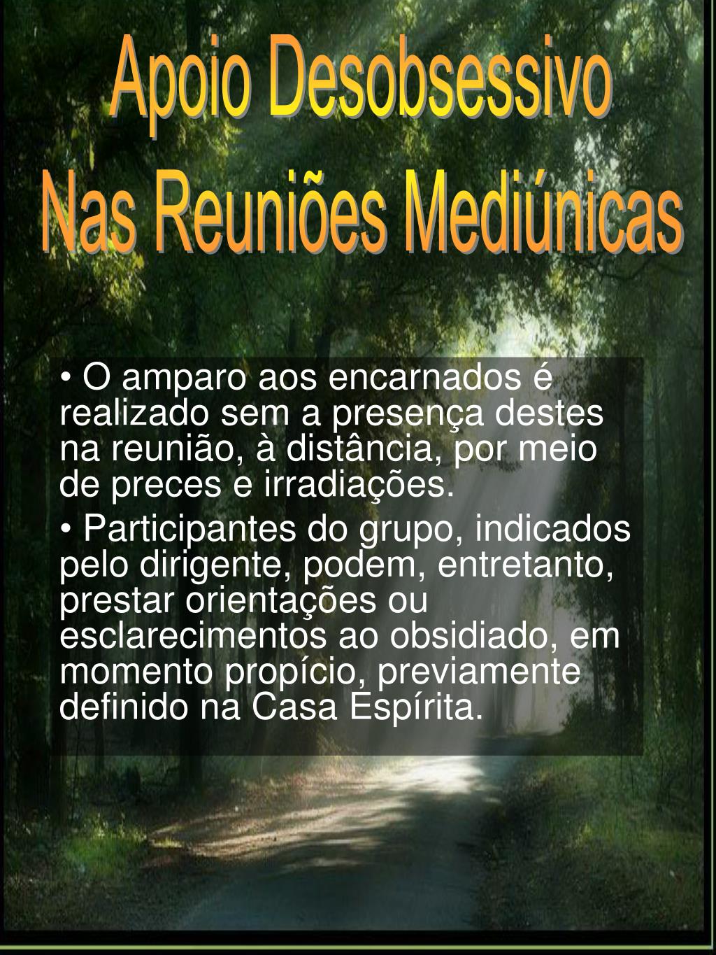 Apoio Desobsessivo Nas Reuniões Mediúnicas • O amparo aos encarnados é realizado sem a presença destes na reunião, à distância, por meio de preces e irradiações. • Participantes do grupo, indicados pelo dirigente, podem, entretanto, prestar orientações ou esclarecimentos ao obsidiado, em momento propício, previamente definido na Casa Espírita.