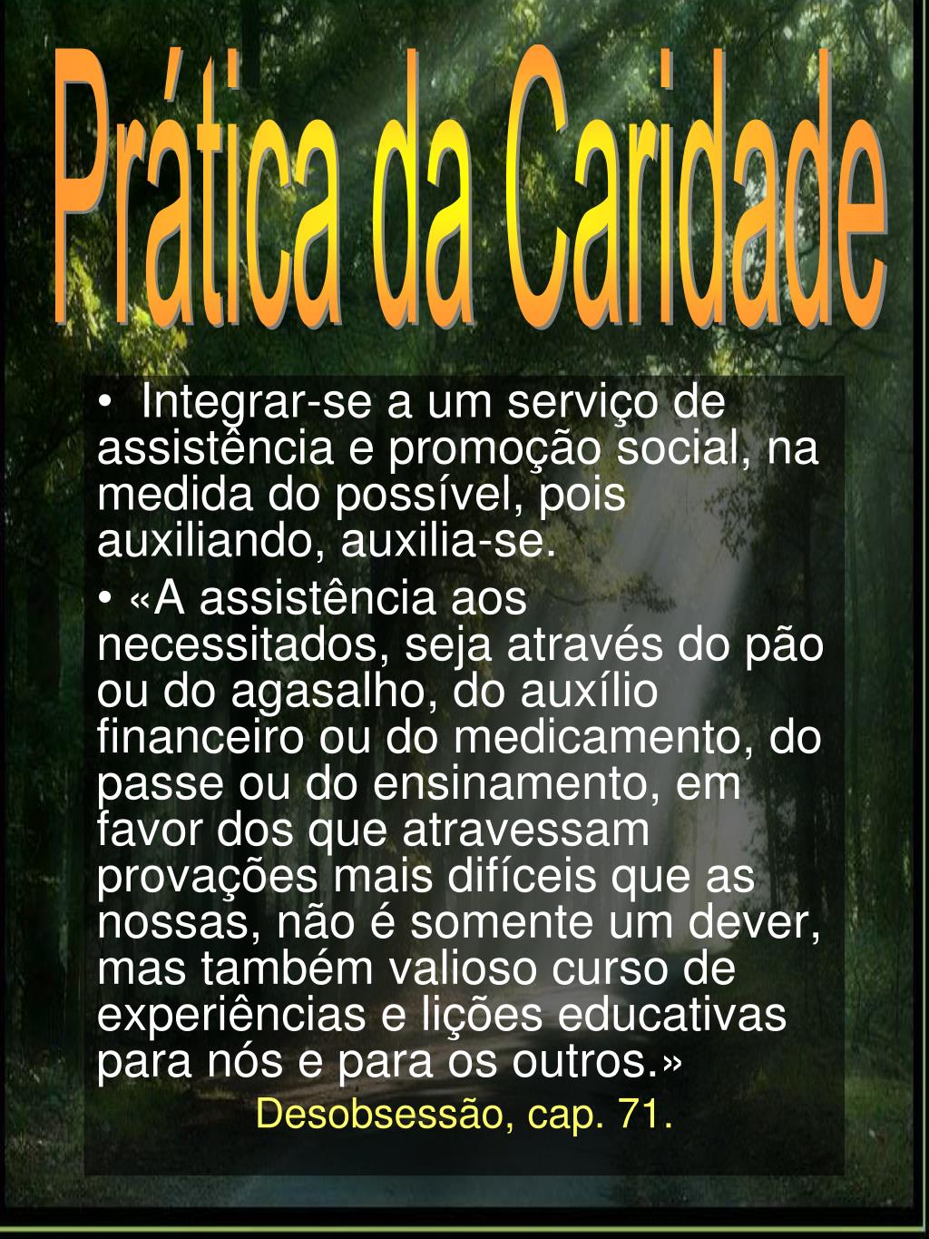 Prática da Caridade • Integrar-se a um serviço de assistência e promoção social, na medida do possível, pois auxiliando, auxilia-se. • «A assistência aos necessitados, seja através do pão ou do agasalho, do auxílio financeiro ou do medicamento, do passe ou do ensinamento, em favor dos que atravessam provações mais difíceis que as nossas, não é somente um dever, mas também valioso curso de experiências e lições educativas para nós e para os outros.» Desobsessão, cap. 71.