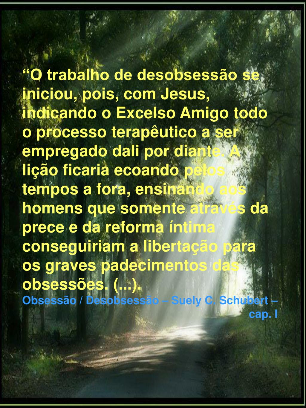 “O trabalho de desobsessão se iniciou, pois, com Jesus, indicando o Excelso Amigo todo o processo terapêutico a ser empregado dali por diante. A lição ficaria ecoando pelos tempos a fora, ensinando aos homens que somente através da prece e da reforma íntima conseguiriam a libertação para os graves padecimentos das obsessões. (...). Obsessão / Desobsessão – Suely C. Schubert – cap. I