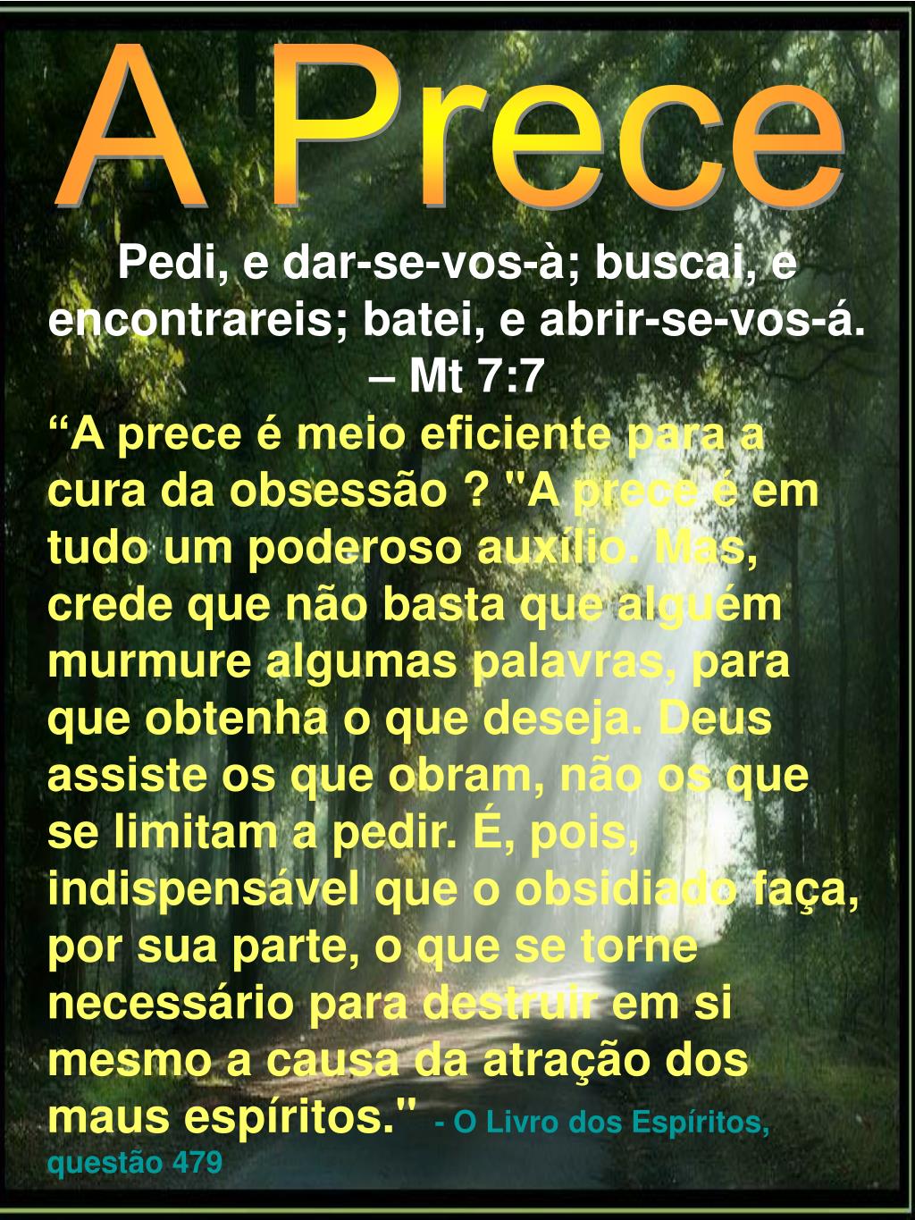 A Prece Pedi, e dar-se-vos-à; buscai, e encontrareis; batei, e abrir-se-vos-á. – Mt 7:7 “A prece é meio eficiente para a cura da obsessão ? "A prece é em tudo um poderoso auxílio. Mas, crede que não basta que alguém murmure algumas palavras, para que obtenha o que deseja. Deus assiste os que obram, não os que se limitam a pedir. É, pois, indispensável que o obsidiado faça, por sua parte, o que se torne necessário para destruir em si mesmo a causa da atração dos maus espíritos."- O Livro dos Espíritos, questão 479
