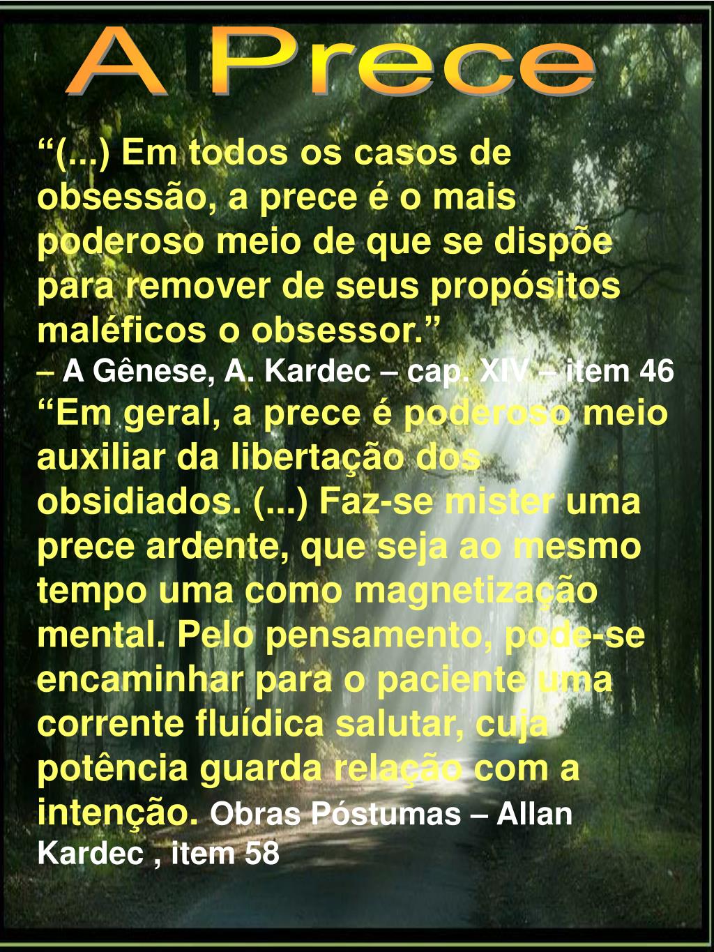 A Prece “(...) Em todos os casos de obsessão, a prece é o mais poderoso meio de que se dispõe para remover de seus propósitos maléficos o obsessor.” – A Gênese, A. Kardec – cap. XIV – item 46 “Em geral, a prece é poderoso meio auxiliar da libertação dos obsidiados. (...) Faz-se mister uma prece ardente, que seja ao mesmo tempo uma como magnetização mental. Pelo pensamento, pode-se encaminhar para o paciente uma corrente fluídica salutar, cuja potência guarda relação com a intenção. Obras Póstumas – Allan Kardec , item 58