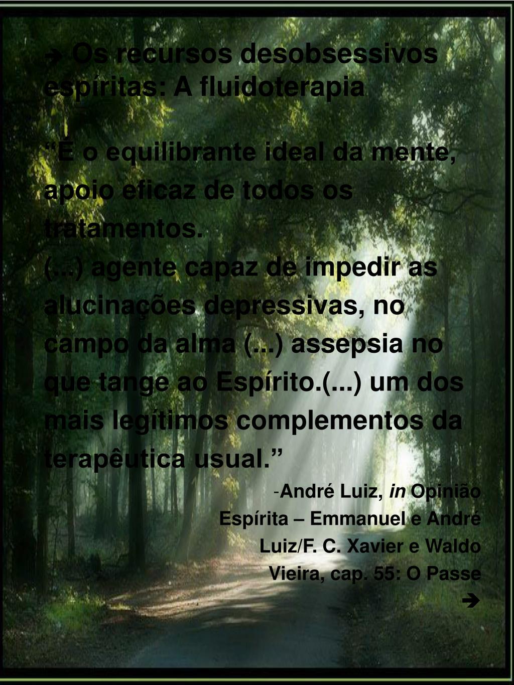 Os recursos desobsessivos espíritas: A fluidoterapia • “É o equilibrante ideal da mente, apoio eficaz de todos os tratamentos. • (...) agente capaz de impedir as alucinações depressivas, no campo da alma (...) assepsia no que tange ao Espírito.(...) um dos mais legítimos complementos da terapêutica usual.” • André Luiz, in Opinião Espírita – Emmanuel e André Luiz/F. C. Xavier e Waldo Vieira, cap. 55: O Passe •