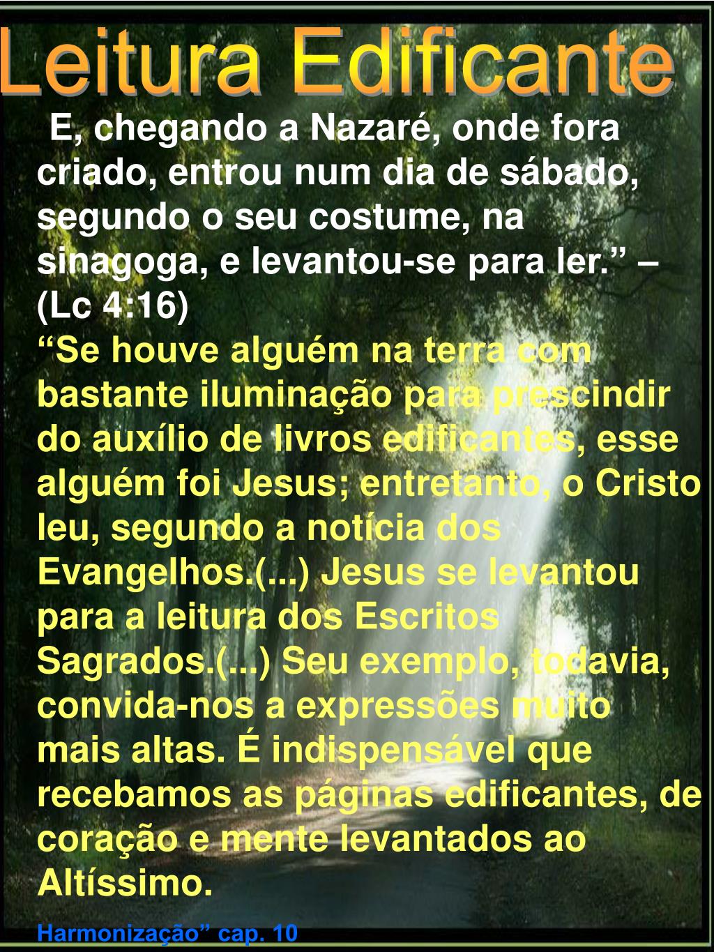 Leitura Edificante “E, chegando a Nazaré, onde fora criado, entrou num dia de sábado, segundo o seu costume, na sinagoga, e levantou-se para ler.” – (Lc 4:16) “Se houve alguém na terra com bastante iluminação para prescindir do auxílio de livros edificantes, esse alguém foi Jesus; entretanto, o Cristo leu, segundo a notícia dos Evangelhos.(...) Jesus se levantou para a leitura dos Escritos Sagrados.(...) Seu exemplo, todavia, convida-nos a expressões muito mais altas. É indispensável que recebamos as páginas edificantes, de coração e mente levantados ao Altíssimo. Harmonização” cap. 10