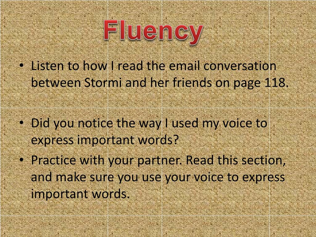 Fluency • Listen to how I read the email conversation between Stormi and her friends on page 118. • Did you notice the way I used my voice to express important words? • Practice with your partner. Read this section, and make sure you use your voice to express important words.